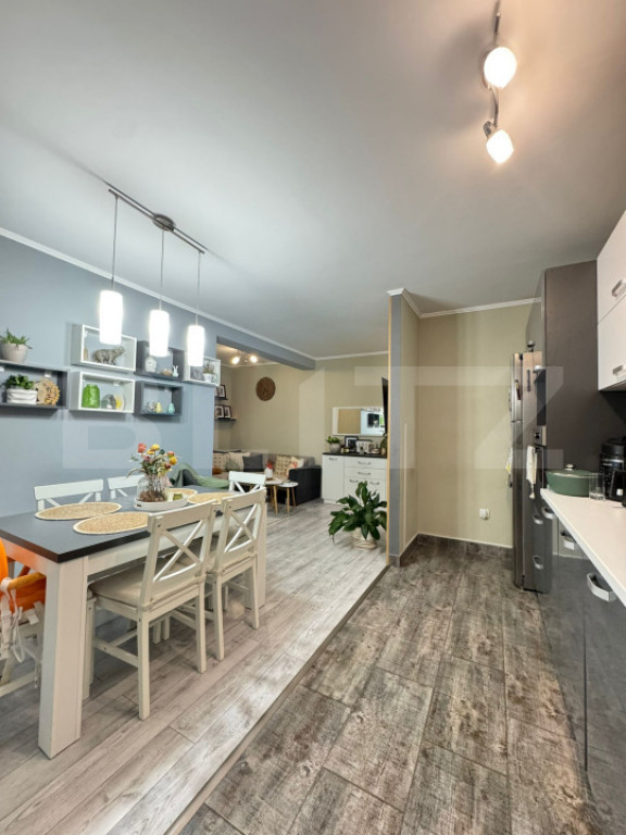 Blitz propune spre vânzare un apartament modern cu 3 camere decomandate, situat la etajul 2 din 4 într-un bloc din 2016, în zona Someșului – Florești, la doar 7 minute de VIVO! Cluj. Suprafață utilă: 61,1 mp + balcon deschis de 3 mp Apartament realizat pentru confort personal — s-au folosit doar materiale și finisaje premium. Dotări & avantaje: • Bucătărie spațioasă, complet mobilată și utilată (inclusiv mașină de spălat vase, cuptor, hotă, aragaz etc) • Mobilă pe comandă, realizată inteligent pe spațiu • 2 dormitoare generoase • Baie cu geam mare pentru lumină naturală și aerisire • Tâmplărie tripan (3 straturi de sticlă) • Aer condiționat • Centrală termică, clasa energetică A – cheltuieli iarna 150-200 lei/lună • Izolație superioară | Poziționat pe mijloc (sunteți încălziți din toate părțile) • Loc de parcare propriu în CF + stație de încărcare pentru mașini electrice • Loc de joacă amenajat pentru copii, exclusiv pentru locatari Zona Someșului – Florești: liniștită, aerisită, cu vecini tineri și prietenoși. Aproape de stații de transport în comun, magazine, iar la parterul blocului vecin se construiește un magazin nou retail. Programează acum o vizionare și hai să-ți trezești sentimentul de acasa! Cod ofertă / ID BLITZ: P154642 Id intern: P154642