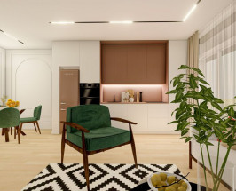 Apartament compus din dormitor, living cu bucătărie open space, o baie