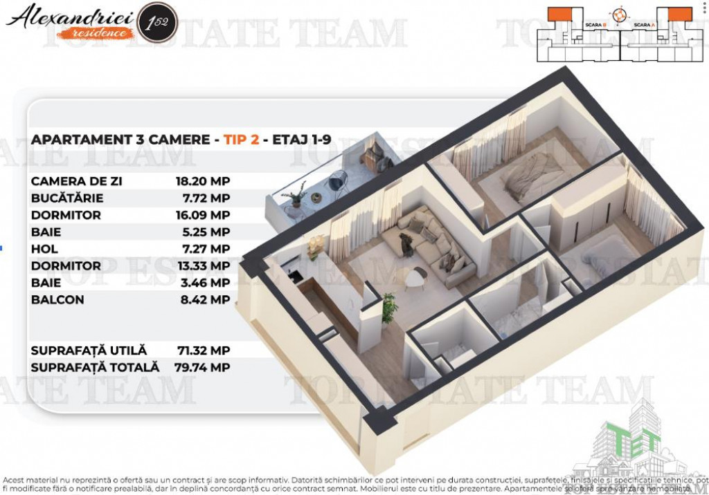 Cel mai important constructor din Ardeal este prezent cu primul proiect in Bucuresti Apartament cu 3 Camere la standard de confort si performanta ridicate pe Soseaua Alexandriei, Bucuresti, intr-un proiect in constructie sustinut de un dezvoltator cu peste 25 de ani de experienta si rezultate remarcabile. Fiecare locuinta din acest proiect este gandita cu grija atat pentru spatiul interior, cat si pentru mediul inconjurator, astfel incat cei care aleg achizitionarea unui apartament sa se simta cu adevarat acasa. Apartamentul are o suprafata utila de 71.32, suprafata totala de 79.74mp si este compartimentat dupa cum urmeaza: Camera de zi: 18.2 mp Bucatarie: 7.72 mp Dormitor: 16.09 mp Baie: 5.25 mp Hol: 7.27mp Dormitor: 13.33 mp Baie: 3.46 mp Balcon: 8.42 mp Detalii tehnice: Centrala imobil: Centrale montate in cascada, Viessman, Buderus sau Ariston. Structura rezistenta: Beton armat, planseu tip dala. Fundatie: Radier general. Pereti exteriori: Zidarie din beton celular autoclavizat, 30 cm. Pereti intre apartamente: Zidarie din beton celular autoclavizat, 25 cm. Pereti interiori: Zidarie din beton celular autoclavizat, 12,5 cm. Icirc;naltime utila nivel: 2,75 m. Fatade: Termosistem polistiren 10 cm cu tencuiala decorativa. Terasa: Hidroizolatie membrana PVC (Sika), termoizolatie vata minerala 20 cm. Instalatii electrice: Cupru. Tablouri electrice apartamente: Eaton. Finisaje interioare: Usa acces apartament: Metalica, Blindo 2, Pinum, cu toc metalic, structura din otel zincat, balamale reglabile si izolatie din vata minerala; inchidere in 3 puncte, culoare gri transversal. Usi interioare: Model Revers, structura perimetrala din lemn, panouri MDF laminat, culoare alba. Parchet: SPC, 6 mm, compatibil cu incalzire in pardoseala, Clasa 34, producator PINUM. Faianta baie: Placi ceramice 30x60 cm, model Living Beige, Ecogres. Gresie baie/bucatarie/balcoane: Ecogres, Pietre di Sardegna, Casalgrande Padana, Basaltina. Pardoseli spatii comune: Aceiasi producatori ca pentru gresie. Robinetarie: Hertz. Sanitare: Vas WC, lavoar, cada si dus Ideal Standard. Ferestre si usi balcon: PVC Salamander GreenEvolution 76 MD, 6 camere. Climatizare: Multisplit Gree. Icirc;ncalzire: Pardoseala, Uponor sau Rehau. Prize si intrerupatoare: Legrand sau Gewiss. Icirc;n apropierea exista o varietate de zone de interes: Centre comerciale importante Parcuri si spatii verzi, ideale pentru relaxare si activitati recreative Transport public rapid ndash; statiile de autobuz si tramvai sunt la doar cativa pasi, asigurand conexiuni rapide cu restul capitalei Scoli si gradinite, perfecte pentru familiile cu copii Restaurante, cafenele si locatii de divertisment, pentru o viata urbana vibranta si accesibila