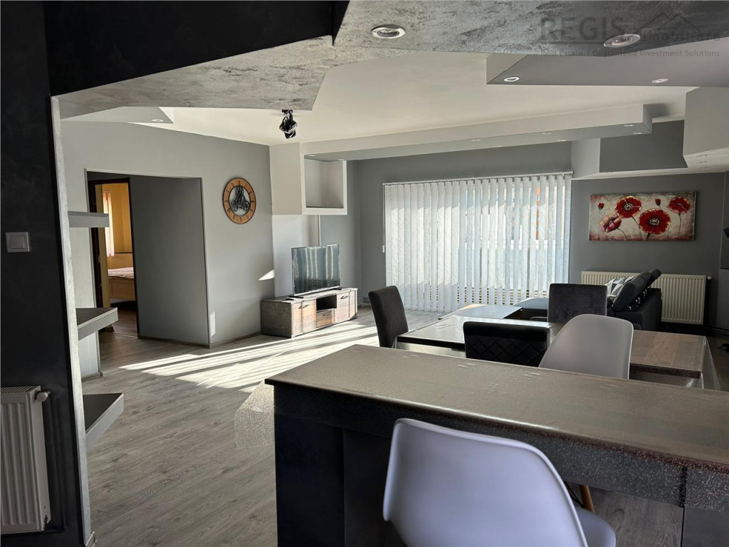 ID intern: 6425 REGIS Imobiliare va propune spre vanzare un apartament spatios de 3 camere, situat intr-un imobil cu lift nou, in zona premium Centrul Civic ndash; Brasov. Proprietatea este amplasata intr-un cartier urban bine organizat, cu acces rapid catre toate punctele de interes ale orasului: institutii, centre comerciale, scoli, restaurante si mijloace de transport. Apartamentul a fost recent renovat si se prezinta in conditii foarte bune, fiind ideal pentru o familie sau pentru cei care isi doresc confort, spatiu si o locatie excelenta. Compartimentare: - Hol de intrare - Living foarte generos, open space cu bucataria, amenajat modern - Hol de acces catre zona de noapte - Dormitor matrimonial cu baie proprie - Dormitor - Baie de serviciu - Balcon - Boxa la subsol Bucataria este complet echipata cu aragaz, cuptor electric, frigider si masina de spalat vase. Dotari si beneficii: - Centrala termica proprie - Usa metalica antiefractie - Orientare S-E - Aer conditionat - Apartament complet mobilat si utilat - Lift nou in imobil Transformarea apartamentului ofera un living amplu, perfect pentru relaxare si socializare, sporind semnificativ confortul locuintei. Proprietatea este disponibila imediat si reprezinta o oportunitate excelenta de achizitie intr-una dintre cele mai apreciate zone ale Brasovului. Pret de vanzare: 218.000 euro ndash; pret fix. Comisionul agentiei- 2% TVA. Agent Imobiliar- Stefania
