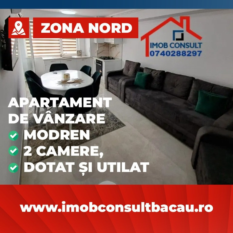 Visezi la un cămin confortabil sau o investiție de succes? Acest apartament modern din Complexul Bacovia, Zona Nord, este alegerea perfectă! Suprafață utilă: 50 mp; Compartimentare: Decomandat; Living modern cu bucătărie open space – complet mobilat și utilat; Dormitor modern – amenajat cu rafinament; Baie elegantă – dotată cu mobilier de calitate; Hol generos și balcon – spațiu suplimentar pentru relaxare; Etaj 5/8 – acces rapid cu lift (doua lifturi); Incalzire in pardoseala: Construcție 2021 – finisaje de calitate superioară; Loc de parcare inclus. Locuința se află într-o zonă liniștită, aproape de centre comerciale, restaurante, transport public și toate facilitățile necesare. Pentru mai multe informații și programări la vizionare, nu ezita să ne contactezi: - Corina: 0740 288 297; - Lacramioara: 0758 262 533, sau la sediul agenției noastre, Imob Consult Bacau, situat pe strada Banca Națională nr. 27 la intersecția cu Str. Neagoe Vodă, langa Irish Pub.