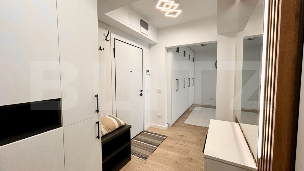 Blitz vă propune spre închiriere un apartament cu 2 camere, situat în complexul rezidențial Prima Green. Proprietatea se află la prima închiriere, fiind situată într-un imobil nou, dotat cu lifturi de ultimă generație. Detalii tehnice: Decomandat. Suprafață utilă: 61 mp. Etaj: 4 din 10. Structură: Dormitor matrimonial, living, bucătărie închisă (separată), baie dotată cu cadă. Apartamentul este complet mobilat și utilat, dispunând de dotări moderne: Sistem de încălzire: Încălzire în pardoseală cu contorizare individuală. Climatizare: Sistem de aer condiționat. Bucătărie: Complet echipată cu plită pe inducție, cuptor electric, hotă, combină frigorifică și mașină de spălat vase. Alte dotări: Televizor Smart și mașină de spălat rufe. Loc de parcare privat inclus în prețul chiriei. Cod ofertă / ID BLITZ: P166948 Id intern: P166948