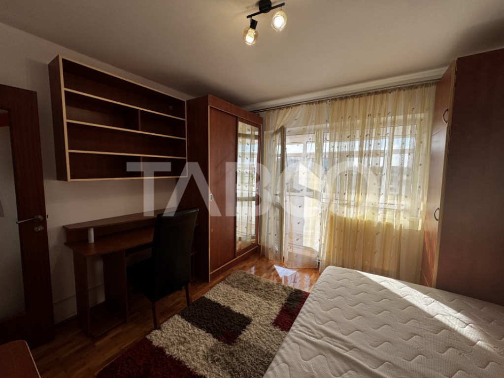 TABOO Imobiliare propune un apartament de inchiriat cu 2 camere, decomandat, situat in localitatea Sibiu, zona Vasile Aaron, aflat la etajul 4 intr -un imobil tip bloc cu regim de inaltime pe Parter + 4 Etaje; anul constructiei 1980, structura beton. Suprafata utila de 51 mp + balcon de 8 mp.
