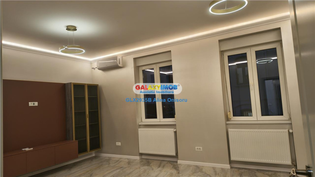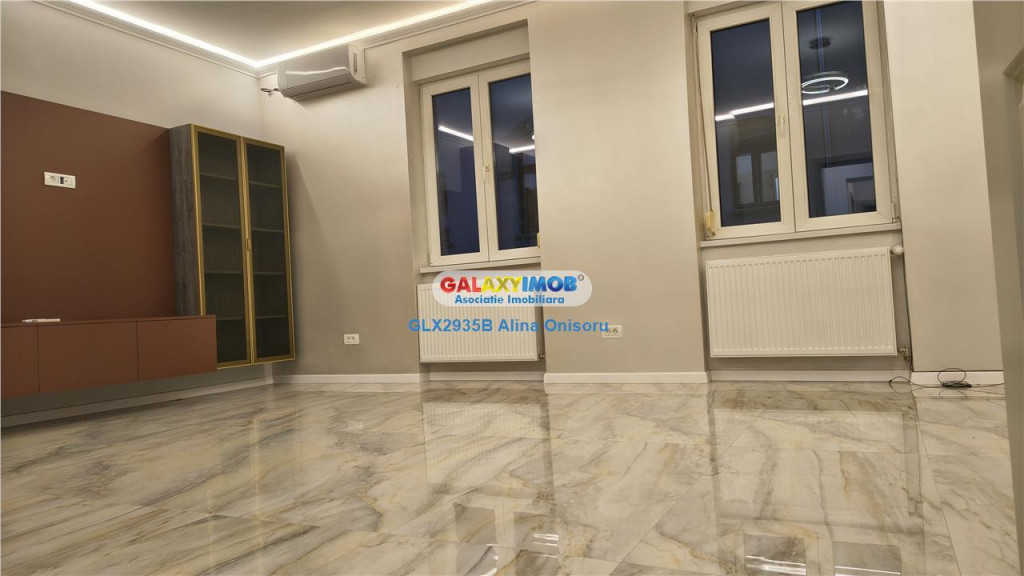 Proprietatea se afla la doar 500 de metri de Grand Hotel Bucharest, Teatrul National si Piata Universitatii, iar Ateneul Roman este situat la aproximativ 650 de metri. Zona este ultracentrala, cu acces rapid catre facultati, institutii culturale si Gradina Icoanei, aflata la cateva minute de mers pe jos. In apropiere se gasesc numeroase ambasade, precum Ambasada Ungariei aprox 200 m, Ambasada Marii Britanii aprox 550 m si Ambasada Austriei aprox 700 m, ceea ce confera zonei un grad ridicat de siguranta si un profil profesional. Datorita pozitionarii, spatiul se preteaza excelent pentru activitati de birouri, cabinet, notariat, psihologie, alte servicii premium, cat si pentru locuit. Galaxy Imob va propune spre inchiriere un apartament renovat complet, situat la parterul unui imobil cu caracter interbelic, intr-o zona foarte linistita si ultracentrala. Spatiul este finisat cu materiale de calitate, oferind un ambient modern si elegant. Caracteristici principale Parter, acces rapid Decomandat, cu trecere fireasca intre camere Compartimentare practica, cu zone pentru living, bucatarie si zona de lucru sau odihna Hol generos cu mobilier facut la comanda Balcon Oglinzi cu iluminare LED si lumini ambientale pe tavan Dotari si utilitati Centrala termica proprie Aer conditionat Bucatarie complet mobilata si utilata frigider plita electrica hota cuptor electric masina de spalat rufe Cabina de dus tip walk in Mobilier si usi interioare MDF premium Interfon Finisaje Gresie portelanata cu aspect de marmura Mobilier realizat la comanda Detalii decorative si iluminat care ofera un aspect modern si rafinat Informatii eficienta energetica: Clasa energetica: Consumul de energie primara: Indicele de emisii echivalent CO2: Consum de energie din surse regenerabile: