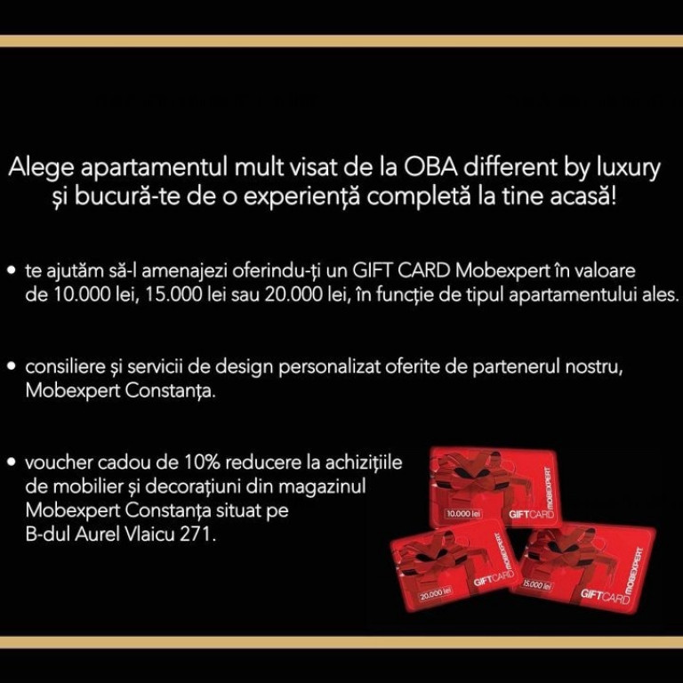 - te ajutăm să amenajezi noul apartament, oferindu-ți un GIFT CARD Mobexpert în valoare de 10.000 lei, 15.000 lei sau 20.000 lei, în funcție de tipul apartamentului ales