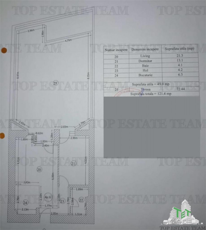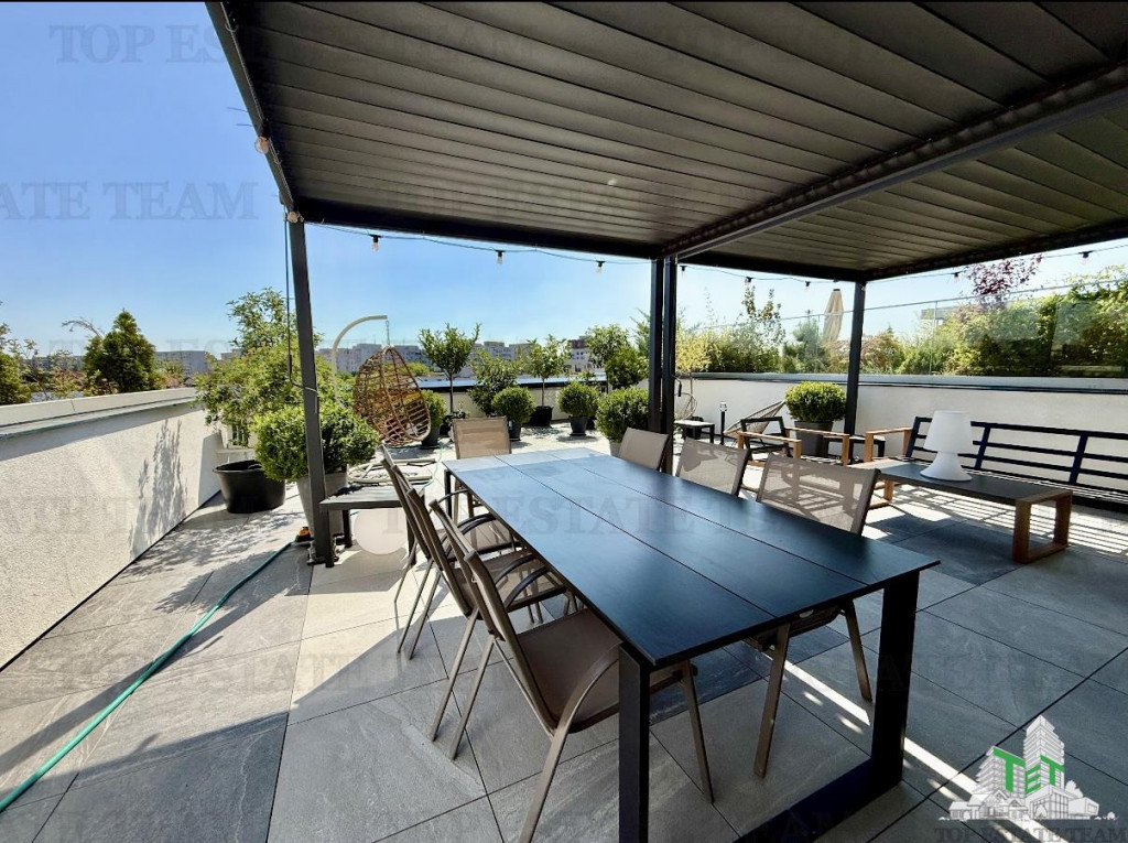 Apartament Superb cu 2 Camere si Terasa de 72 mp ndash; langa Parcul Floreasca Imobil Nou Finalizat in 2020 ndash; Design Premium, Locatie de Top Descopera un apartament modern cu 2 camere, situat intr-un bloc nou construit in 2020, pe strada Barbu Vacarescu, la doar cativa pasi de Parcul Floreasca si in imediata apropiere de zona de business si Mall Promenada. Cu o terasa spectaculoasa de 72 mp, aceasta proprietate este ideala pentru relaxare urbana, evenimente in aer liber sau investitie sigura in nordul Capitalei. Detalii Tehnice Apartament: Suprafata utila totala: 49,0 mp Suprafata utila compartimentata: Living: 21,3 mp Dormitor: 13,1 mp Baie: 4,1 mp Hol: 4,2 mp Bucatarie: 6,3 mp Terasa amenajata: 72,44 mp Suprafata totala: 121,4 mp Finisaje si Dotari Premium: Centrala termica Buderus si incalzire in pardoseala Aer conditionat Daikin in living si dormitor Parchet triplu stratificat si usi interioare cu inchidere magnetica Baie eleganta cu finisaje ceramice rectificate Obiecte sanitare Villeroy amp; Boch Tamplarie din aluminiu Suko pentru izolare termica si fonica superioara Terasa Unica ndash; 72 mp Amenajata Profesional: Hidroizolatie profesionala in 3 straturi: bitum PVC poliuree armata Gresie portelanata flotanta, montata pe ploturi Pergole bioclimatice ndash; confort in orice sezon Mobilier de exterior premium Iluminat ambiental pentru atmosfera relaxanta Beneficii si Locatie: Apartament nou, nefolosit n