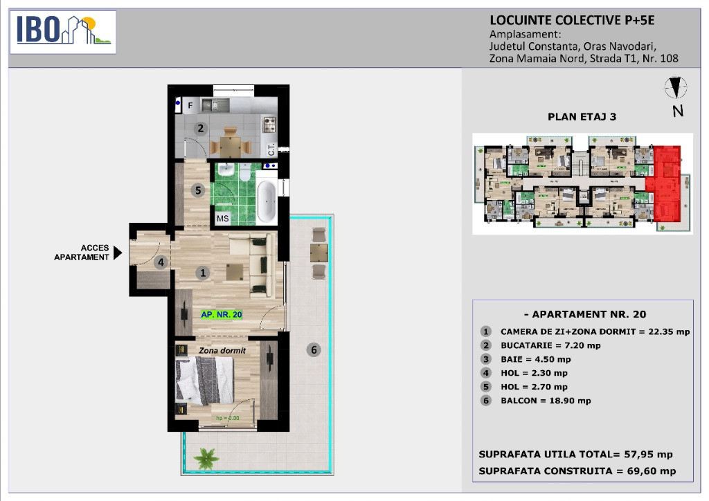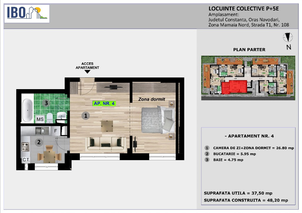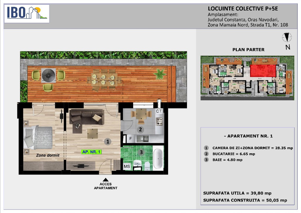 IBO - T 1 nr 108 www.rezidentialeconstanta.ro Telefon: 0747 426 426 MODALITĂȚI DE PLATĂ : - plată integrala la acest moment - Avans de 30 % si diferenta platibila pana la predare Proiectul IBO T1 nr 108 situat pe strada T1 este destinat persoanelor care își doresc să locuiască sau sa investească într-un apartament situat într-o zonă exclusivistă din Mamaia Nord, acesta fiind compus din apartamente tip studio cu 1 cameră, cu suprafețe cuprinse între 37,50 mp – 51,80 mp. Imobilul este situat la o distanţă de 300 m fata de Lidl Mamaia Nord , 500m de plajă şi promenadă, zona cu numeroase beach baruri, restaurante , fiind construit in zonă complet sistematizată, cu toate utilitatile. Imobilul dispune de lift cu o capacitate de 6 persoane si locuri de parcare disponibile in incintă .