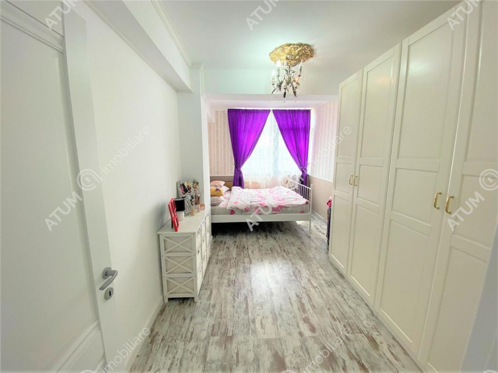 De vanzare apartament spatios cu 3 camere decomandate si balcon, situat in zona Doamna Stanca din Selimbar. Apartamentul are suprafata utila de 70 mp, distribuita pe living cu bucatarie de 34 mp, 2 dormitoare de 13.47 mp, respectiv 13.90 mp, baie de 4.56 mp si hol de acces unde se poate amenaja cuier si pantofar de 4 mp. Separat de suprafata utila mai beneficiaza de un balcon de 4.35 mp. Locuinta este luminosa datorita pozitionarii si a suprafetei vitrata, cu vedere catre Muntii Fagaras, dormitor matrimonial cu iesire pe balcon, dormitor generos, baie cu cabina de dus. Apartamentul detine finisaje de inalta calitate, centrala termica proprie cu calorifere din otel, parchet, ferestre cu geam din termopan, aer conditionat, gresie, faianta, obiecte sanitare de calitate, usa de metal la intrare, usi de lemn pe interior. Imobilul are in vecinatate magazine alimentare, centre comerciale, hypermarketuri, scoli, gradinite si alte puncte de interes public. Valoarea de achizitie a apartamentului este de 124.700 euro si poate fi achizitionat si prin accesarea unui credit bancar. ID intern: 3043.