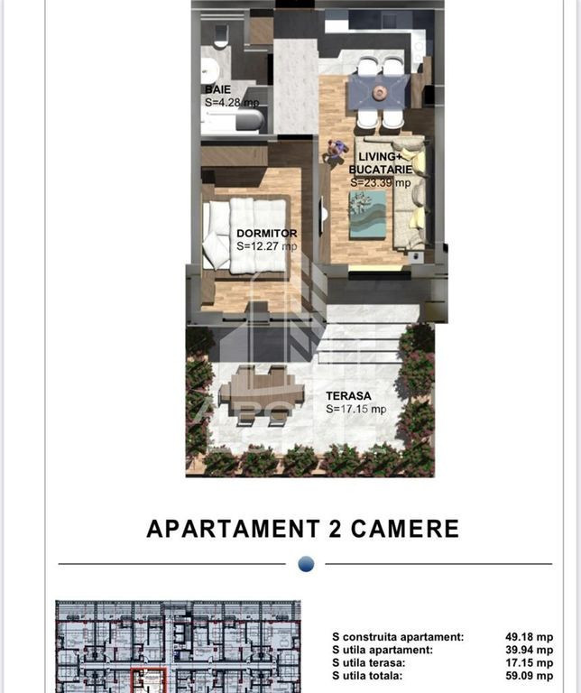 APOSTU ESTATE are placearea de a va oferi spre vanzare la cumparator apartamente cu 2 camere in zona Torontalului. Deasemenea apartamentele cu 2 camere de la parter sunt prevazute si cu o terasa spatioasa numai buna prentru un moment de relexare sau pentru serile cu prietenii. Apartamentele se vand in stadiul final, la cheie. Aditional apartamentului se poate achiziona si un loc de parcare. Pretul unui loc de parcare exterior este 5.700 euro respectiv 7.700 un loc de parcare subteran. Termenul de finalizare este Septembrie 2026. Detalii tehnice: -Protectie fonica si termica cu geam termopan tricameral; -Usi de apartament blindate cu multiple puncte de inchidere; -Peretii exteriori din caramida Porotherm de 25 cm; -Doua lifturi de ultima generatie; -Centrala proprie SMART in condensare de 24 kw Bosch; -Incalzire in pardoseala; -Aer conditionat SMART Romstal cu o capacitate de racire de 12.000 BTU in fiecare apartament; -Incinta securizata (supraveghere video, bariera, interfon); -Izolatie exterioara; -Obiecte sanitare (lavoar + vas toaleta + cada) Suprafetele apartamentelor sunt cuprinse intre 46 mp si 55 mp utili. Oferim consultanta si solutii financiare prin colaboratorii nostri. Va invitam cu drag la o vizionare! ID intern: CP1899068