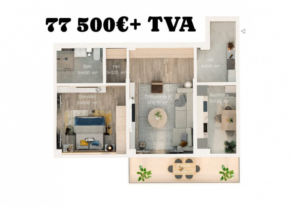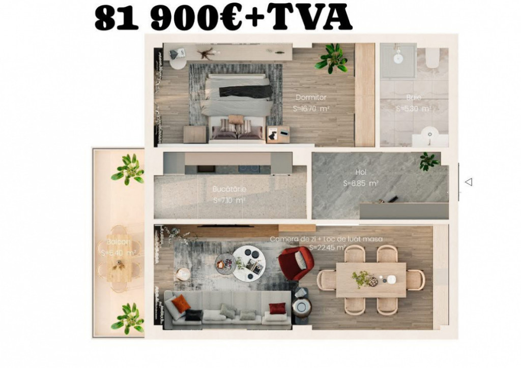 * 1 cameră - 43 mp total * 2 camere (cu două tipuri de compartimentare)  -  65 mp total.* 3 camere 85 mp total.