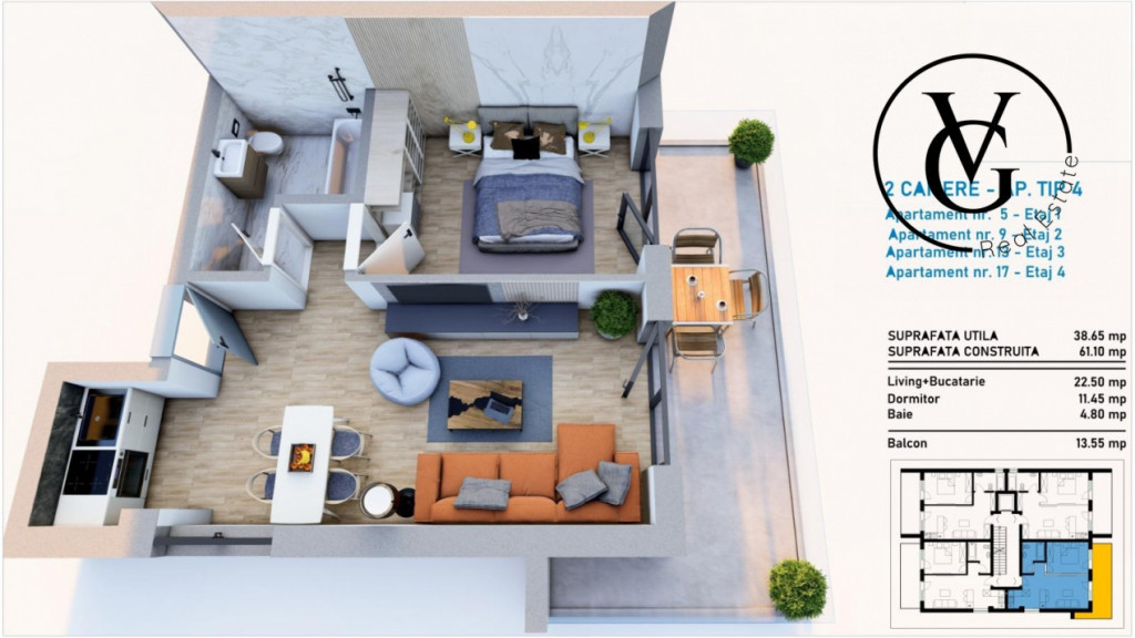• Tipul apartamentului: 2 camere, tip: open-space.
