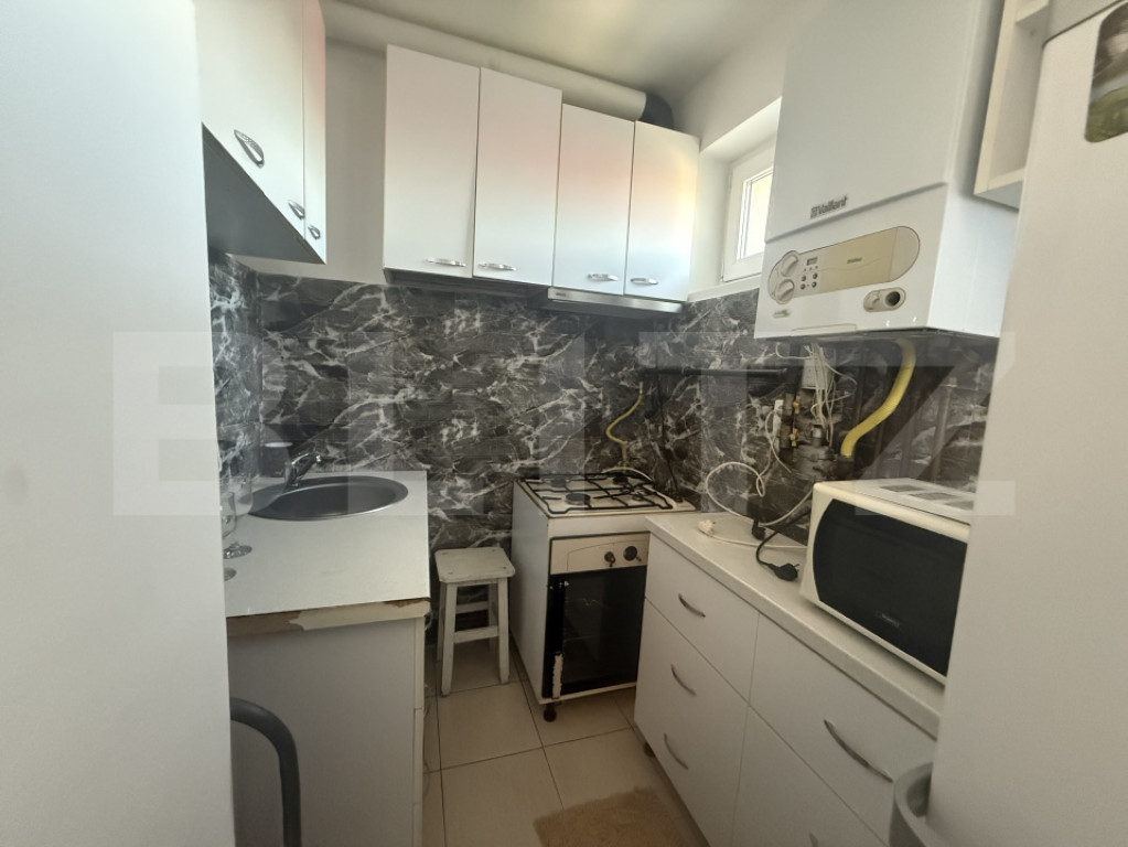bucătărie open-space, mobilată și utilată (aragaz, frigider, cuptor cu microunde, centrală termică)