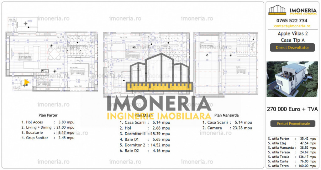 Esti in cautarea unei locuinte cu o suprafata generoasa si optim compartimentata, amplasata intr-o zona linistita dar cu acces facil catre oras ? A, da, si cu Comision 0% Cumparator? :) Ce ai zice daca casele sunt amplasate intr-o zona cu regim mic de inaltime, in imediata vecinatate a metroului Nicolae Grigorescu ( 1,2 km - 15 minute de merg pe jos) si a terenurilor de sport amenajete de Primaria Sectorului 3 ( 500 m - 7 minute de mers pe jos)? Daca raspunsul este afirmativ, atunci….te asteptam la vizionare! Alege sa mergi la vizionare cu un inginer! Programeaza o vizionare! Ne vedem pe santier! Complexul cuprinde 2 case tip Duplex si se afla la 500 m fata de Blv. Nicolae Grigorescu si 15 minute de mers pe jos (1.2 km) fata de statia de metrou Nicolae Grigorescu. Casele se predau “la cheie”. Specificatii tehnice generale/dotari: - structura de rezistenta: cadre beton armat C20/25 - B350 ( stalpi, diafragme, grinzi, plansee) - fundatie din grinzi continue beton armat B350 izolata cu polistiren extrudat XPS 10 cm - zidarie exterioara : caramida Wienerberger Porotherm 30 cm - zidarie interioara : caramida Wienerberger Porotherm 11.5 cm - plansee beton armature C20/C25 , 16 cm - geamuri termopan profil PVC Salamabnder cu 7 camere termice, geam tripan 3 foi 52 mm , feronerie ROTO NX - termoizolare cu polistiren 10 cm + tencuiala decorativa Baumit si placare cu caramida Klinker ( parter). - tabla din otel 0.5mm, Wetterbest , garantie 20 ani - termoizolatie mansarda - insertie fibre de celuloza, 20 cm - centrala termica in condensatie, 24 kW, prevazuta cu termostate de ambinet in fiecare camera - incalzire prin pardoseala, Hertz (Austria) , teava PE-RT cu barierea de oxigen 17X2 mm, distribuitoare inox si conectori sertizare Hertz. - obiecte sanitare : Rezervoare + vase WC ingropate TECE - pardoseala bucatarii, bai: placari ceramice - pardoseala living si dormitoare : parchet laminat - pregatiri electrice aer conditionat - usa metalica acces, cu inchidere multipunct, izolata la interior cu vata bazaltica, Mega Doors - curte imprejmuita cu gard din lemt tratat cu fundatie din beton armat si amenajata - 2 parcaje amenajate in fata casei - utilitati asigurate din retelele publice - curent trifazat - finisaje la alegere pe baza unui buget generos Reprezentam dezvoltatorul in mod direct si nu percepem comision pentru serviciile oferite ( consultanta tehnica, consultanta imobiliara, consultanta financiara - COMISION 0% ). Id intern: P137501