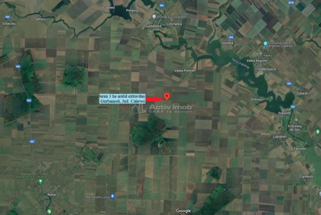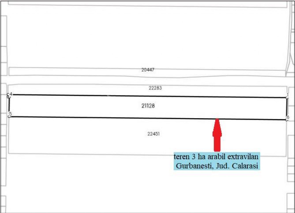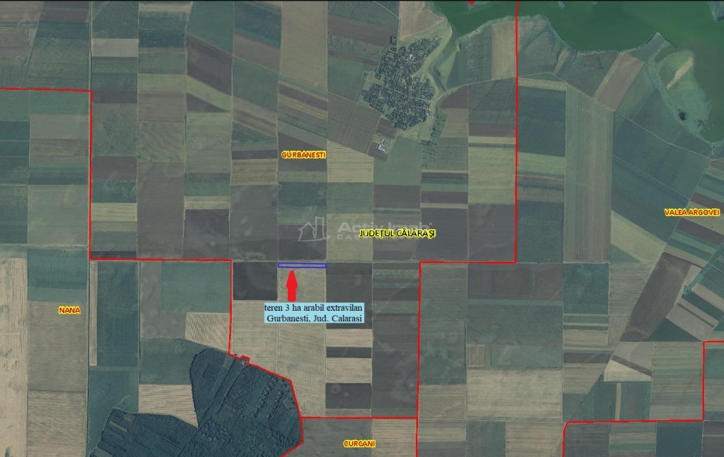 Ofer spre vanzare, in reprezentare exclusiva, cu comision 0 pentru cumparator, teren arabil, extravilan, in suprafata de 3 ha (30000 metri patrati), situat la aproximativ 2 km sud-vest de localitatea Valea Presnei, comuna Gurbanesti, judetul Calarasi, 1,4 km nord de Padurea Preasna, 600 de metri est de granita cu comuna Nana si 2 km nord de granita cu comuna Curcani. Se afla in tarlaua 88, parcela 1 si este intabulat, cu cadastru electronic si coordonate in sistem Stereo 70. Puteti vizualiza locatia terenului pe harta, in doua moduri: - pe maps.google.com, introducand in casuta de cautare coordonatele GPS 44.328315, 26.703098 - accesand link-ul: https://www.google.com/maps/place/44°19#39;41.9"N 26°42#39;11.2"E/@44.3283188,26.7005231,470m/data=!3m2!1e3!4b1!4m4!3m3!8m2!3d44.328315!4d26.703098Sentry=ttuamp;g_ep=EgoyMDI1MDUxNS4wIKXMDSoASAFQAw== Terenul este lucrat, este plan si se afla la 25 de metri de canalul de irigatii. Solul este productiv. Are forma dreptunghiulara, cu dimensiunile in jur de 49 metri x 612 metri. Laturile lungi sunt pozitionate spre sud si nord. Actele sunt in regula, fara sarcini. Se poate demara imediat procedura de vanzare, cu respectarea legislatiei specifice tranzactiilor cu terenuri agricole. Terenul este arendat pana in 31.10.2025, cu contract inregistrat la primarie. Pretul terenului este 30000 de euro. Pentru alte informatii sau pentru vizionare, va rog sa ma contactati telefonic. ID ACTIV IMOB: 230547 Ca sa te bucuri!!!