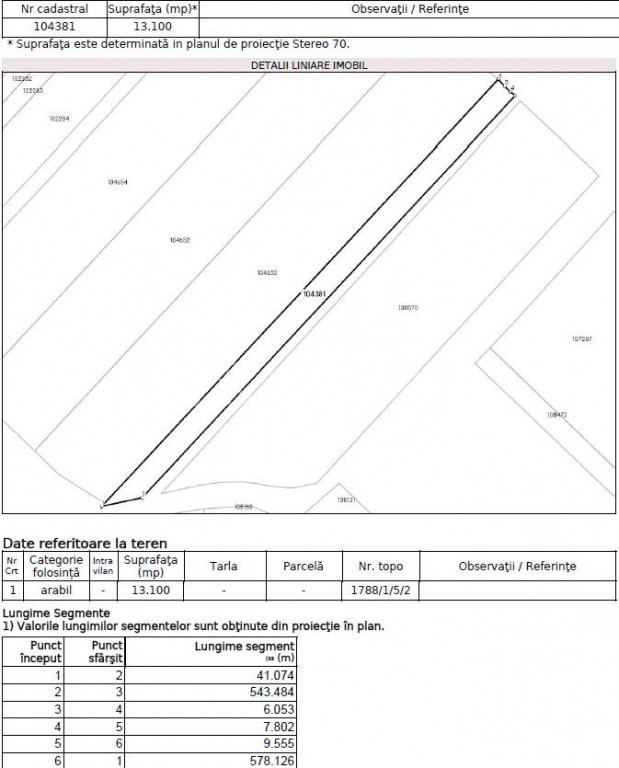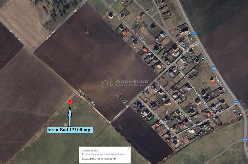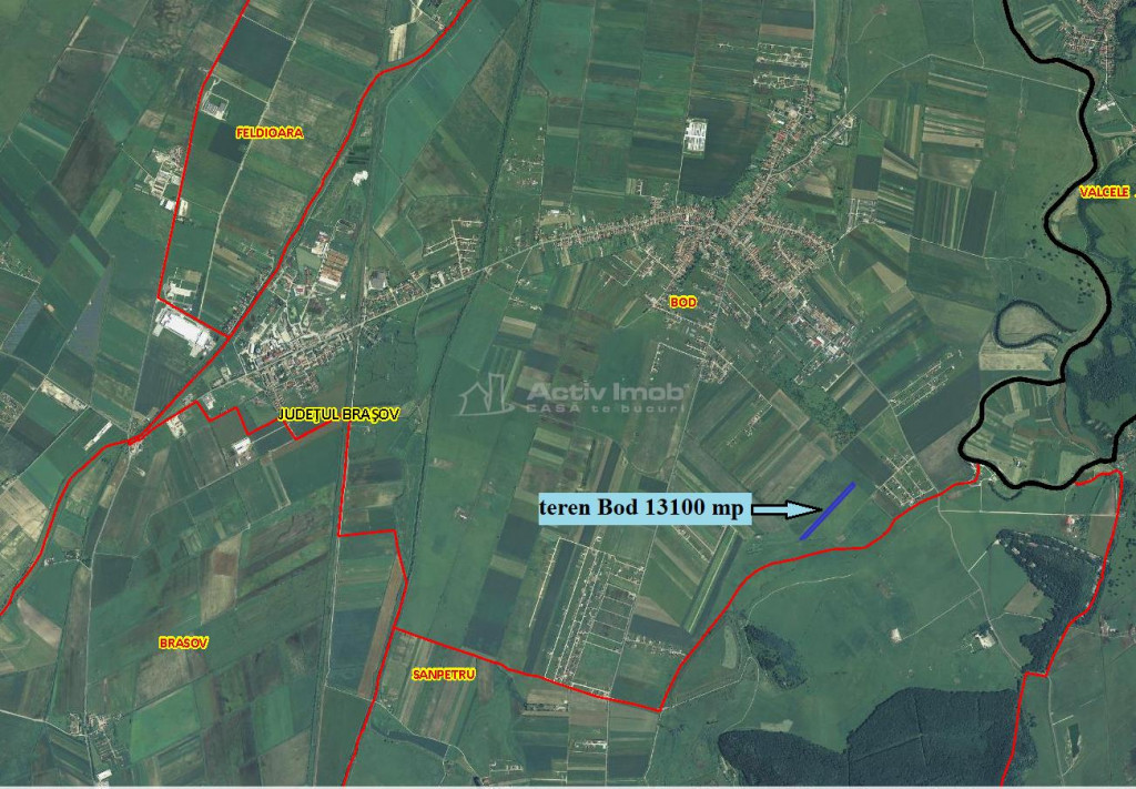 Ofer spre vanzare, in reprezentare exclusiva, cu comision 0 pentru cumparator, un teren arabil extravilan, situat in Bod, judetul Brasov, in suprafata de 13100 mp, cu front de 23,5 metri la stada Prunului, la 250 de metri de cartierul Poiana Craitelor si 500 de metri de cartierul Prunului. Are forma regulata, aproximativ dreptunghiulara, cu dimensiunile aproximative de 23,5 metri x 550 metri. Este accesibil din doua directii, atat dinspre DJ 103, care leaga Bodul de Sanpetru, pe strada Prunului, cat si prin cartierul Poiana Craitelor, din DJ 112A, care leaga Bodul de Harman, pe strada Carpati si, in dreapta, pe strada Prunului. Mai exista o ruta de acces, din DJ 112A, care urca la marginea vechii livezi, pe ramificatia strazii Prunului. Se intinde in lungime dinspre nord-est, spre sud-vest. Il puteti localiza pe google maps cu aceste coordonate Se afla de-a lungul marginii platoului, oferind o panorama larga spre Dealul Lempes, de la cei aproximativ 10 metri diferenta de nivel fata de lunca de la poale. Cam 70% din teren este aproape plat, prezentand, in unele portiuni, o panta mica, iar restul de 30%, care prezinta o panta in jur de 12% cu orientare sudica, este expus spre soare intreaga zi. Comparativ cu mare parte din terenurile din Bod, Sanpetru, Stupini si Harman, panza freatica nu este foarte aprope de suprafata, neexistand riscul, in perioadele ploioase, ca apa sa iasa in subsol sau chiar la suprafata solului. Surse de utilitati se afla la cateva sute de metri distanta, atat la nord ndash; in cartierul Poiana Craitei, cat si la vest ndash; pe strada Prunului. Cadrul natural este superb, bucolic, specific zonei Dealului Lempes, care este incadrata de depresiunea Tarii Barsei si strajuita de Muntii Carpati. Poluarea fonica este redusa, zgomotul traficului rutier desfasurat pe cea mai apropiata sosea: drumul judetean 112A Bod ndash; Harman, fiind la aproximativ 400 de metri distanta. Poluarea luminoasa, deasemenea este mult redusa. Aici se impletesc, in mod echilibrat, frumusetea naturii, cu accesul usor si proximitatea zonei metropolitane a Brasovului cu facilitatile sale. Se preteza pentru infiintarea unei ferme familiale independente, a unei plantatii de capsuni ori arbusti fructiferi sau pentru legumicultura. Pe partea cu inclinatie mare se pot monta eficient panouri fotovoltaice. Este liber la vanzare, fara sarcini sau obligatii. Poate fi folosit imediat dupa achizitie. Detine toate actele necesare pentru inceperea imediata a formalitatilor de vanzare-cumparare: documentatie de achizitie, intabulare cu coordonate stereo 70 si cadastru electronic. Taxele sunt achitate la zi. Pentru a va face o imagine clara, va recomand sa-l vedeti la fata locului. Pretul este 11 euro/mp, negociabil in functie de modalitatea de plata. Se poate plati in 2-3 rate. Pentru alte informatii sau pentru vizionare, va rog sa ma contactati telefonic. ID ACTIV IMOB: 230582 Ca sa te bucuri!!!
