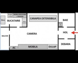 frigider, aragaz, hota, masina de spalat, aparat aer conditionat, canapea, mobilier camera cu multiple zone de depozitare, mobilier bucatarie, masa cu scaune.