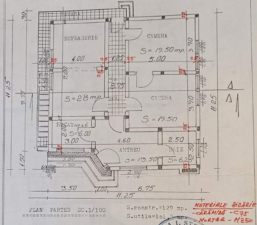 -parter: 2 camere mari de aprox 30mp, hol, baie, bucatarie, antreu avand in total suprafata utila de 101,5mp,