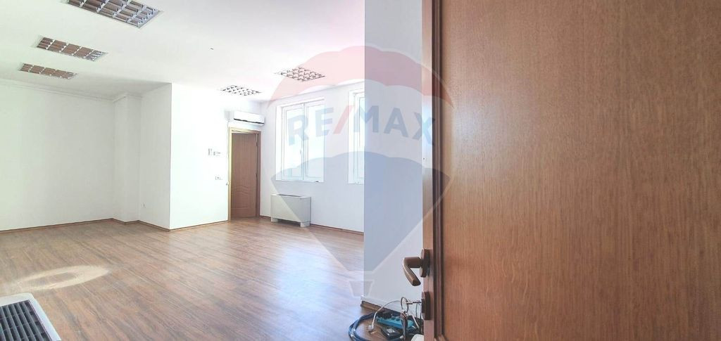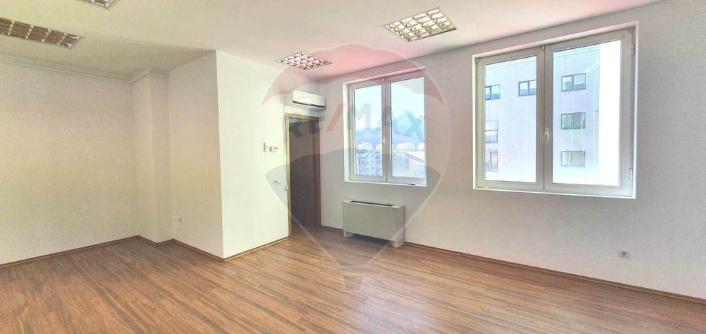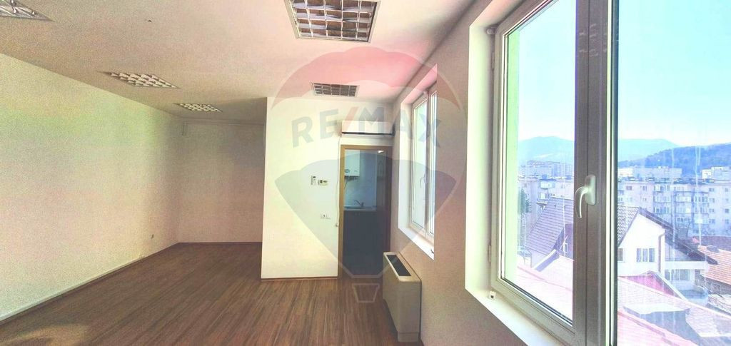 Vă propun spre închiriere un birou luminos și practic, situat în zona centrală a Brașovului, pe Bulevardul Alexandru Vlahuță, într-o clădire de birouri bine întreținută, cu acces la transportul în comun, stațiile RATBV sunt chiar în fața clădirii, iar centrele comerciale sunt în imediata vecinătate. Spațiul se află la etajul 4 fiind accesibil cu două lifturi și scară interioară, are configurație open-space, suprafață utilă de 44,6 mp birou si grup sanitar propriu și oficiu, deci în total 49,6 mp. Se predă proaspăt zugrăvit, cu parchet laminat, tavan casetat, aer condiționat și centrală termică proprie de gaz. Utilitățile curent electric, apă, încălzire, sunt contorizate individual, deci plătiți exact cât consumați. În imobil funcționează cabinete de avocatură, consultanță, clinici medicale și sală de fitness asigurând un mediu profesional și liniștit. Vecinatati: statie taxi, statii autobuz, ITC, Mega Image, Catena, Dr. Max, Carrefour etc Chiria este de 390 euro lunar, TVA 0. Biroul este disponibil imediat și se potrivește foarte bine pentru sediu de firmă, IT, contabilitate, avocatură, consultanță, asigurări, marketing sau cabinet medical. Dacă sună interesant, spuneți-mi când vă convine să-l vizitați, programăm vizionare.