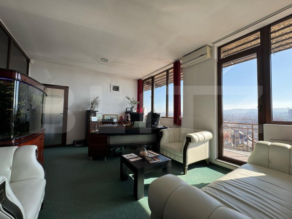 Blitz va propune un birou compartimentat, cu multiple incaperi, situat la etajul 5 al unui bloc de locuinte, dar cu destinatie de birou in CF. Spatiul este finisat. cu lumina naturala generoasa, panorama superba si finisaje moderne, gata de mutat. Poate fi achizitionat si pentru investitie, cu o minima investitie poate fi mobilat isi inchiriat pentru locuinta, la o chirie de cca 1000-1200 de eur/luna. Spatiul beneficiza de locuri de parcare care se pot achizitiona contra cost pentru suma de 8000 de EUR + TVA. Ideal sediu firma sau rezidential. Dispune de o terasa super generoasa, separata , care poate fi achizitionata separat. Pentru mai multe detalii nu ezitati sa ne contactati. Cod ofertă / ID BLITZ: P145699 Id intern: P145699