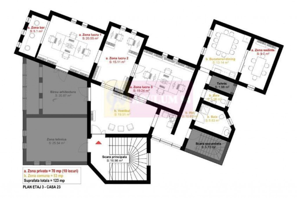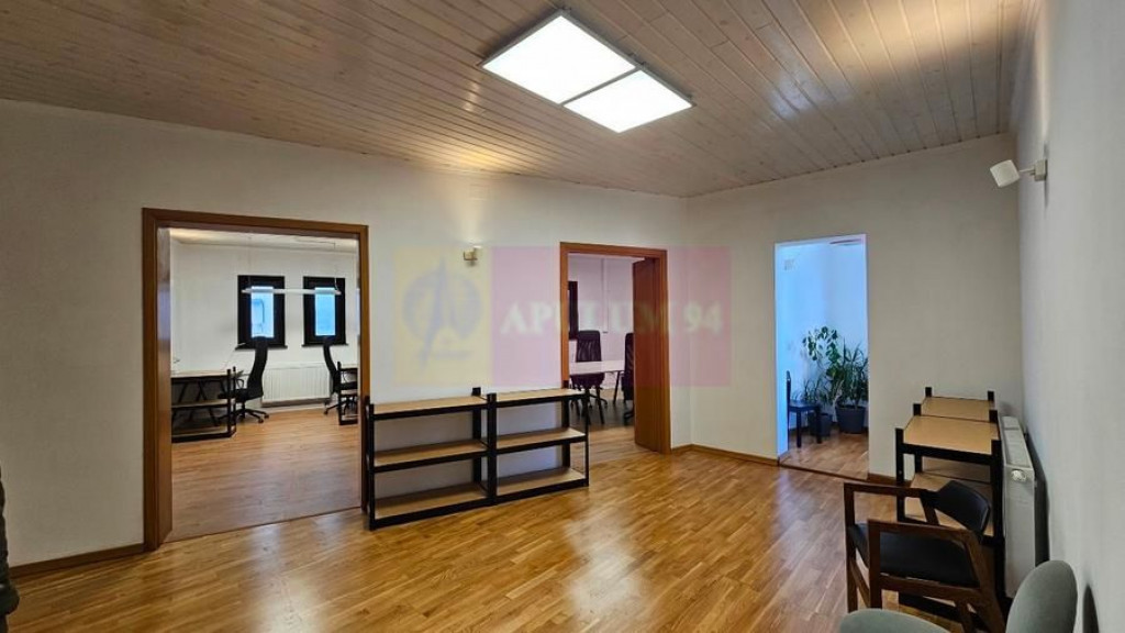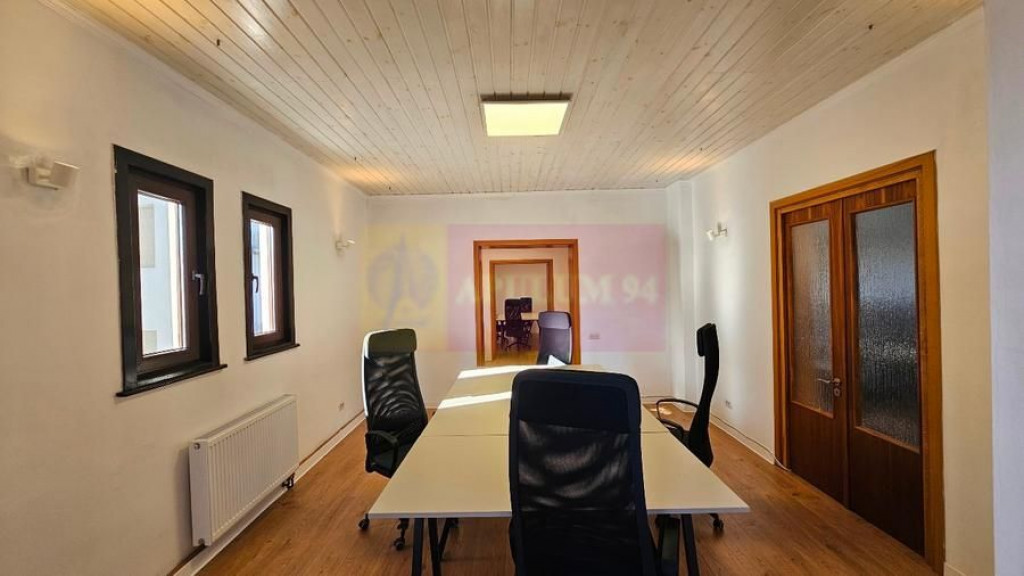 **Birou modern, complet mobilat – ultracentral, Str. George Enescu . Priveliște către Ateneu • 123 mp utili • Prima închiriere** Ofer spre închiriere un birou modern și luminos, situat ultracentral, într-o vilă interbelică consolidată, pe Strada George Spațiul se află la etajul 3 și beneficiază de o priveliște spectaculoasă către Ateneu și Piața Romană. Localizare premium La doar câțiva pași de Piața Romană și Calea Victoriei, spațiul oferă acces rapid către toate zonele centrale ale Bucureștiului. Metrou: 2 minute Stație de autobuz: la scară Zona este una dintre cele mai căutate pentru sedii de firme, datorită proximității față de instituții, ambasade, bănci, restaurante și cafenele. Descrierea spațiului Spațiul are 123 mp utili, organizați într-un mix de open-space și birouri individuale, perfect pentru echipe care au nevoie atât de zone comune, cât și de camere dedicate întâlnirilor și activității concentrate. Compartimentare: 4 încăperi principale de lucru: Cameră 1: 4 posturi (extensibil până la 6) Cameră 2: 2 posturi (extensibil până la 4) Cameră 3: 4 posturi / birou director / cameră de ședințe Cameră 4: Sală de ședințe cu 6 locuri Capacitate totală: până la 10 posturi de lucru Zonă de primire Lounge cu vedere către Ateneu și Piața Romană Bucătărie complet utilată (frigider, cuptor cu microunde, espressor, filtru de apă, masă de 10 persoane) 2 băi moderne, una dotată cu duș Spațiul este împărțit în: 70 mp zonă privată de lucru/ședințe – utilizare exclusivă 53 mp zonă comună, împărțită cu biroul de arhitectură al proprietarului (vestibul, bucătărie, băi) Clădire: Structură rezistentă: cărămidă + beton Suprafață construită: 180 mp 2 căi de acces Dotări & avantaje Mobilier nou IKEA: scaune Markus, birouri Trotten, rafturi depozitare Aer condiționat Centrală proprie pe gaz Finisaje moderne: parchet stratificat, uși din lemn Cameră de supraveghere Acces internet prin cablu și fibră optică Spațiu complet mobilat și utilat – gata pentru mutare imediată Prima închiriere Condiții contractuale 1 lună chirie 1 lună garanție Comision 50%. Un spațiu reprezentativ, luminos și elegant, ideal pentru firme care își doresc vizibilitate, accesibilitate și un mediu profesionist chiar în inima orașului. Dacă îți dorești un sediu central care îmbină prestigiul zonei cu confortul și funcționalitatea, contactează-ne pentru detalii și programează o vizionare.