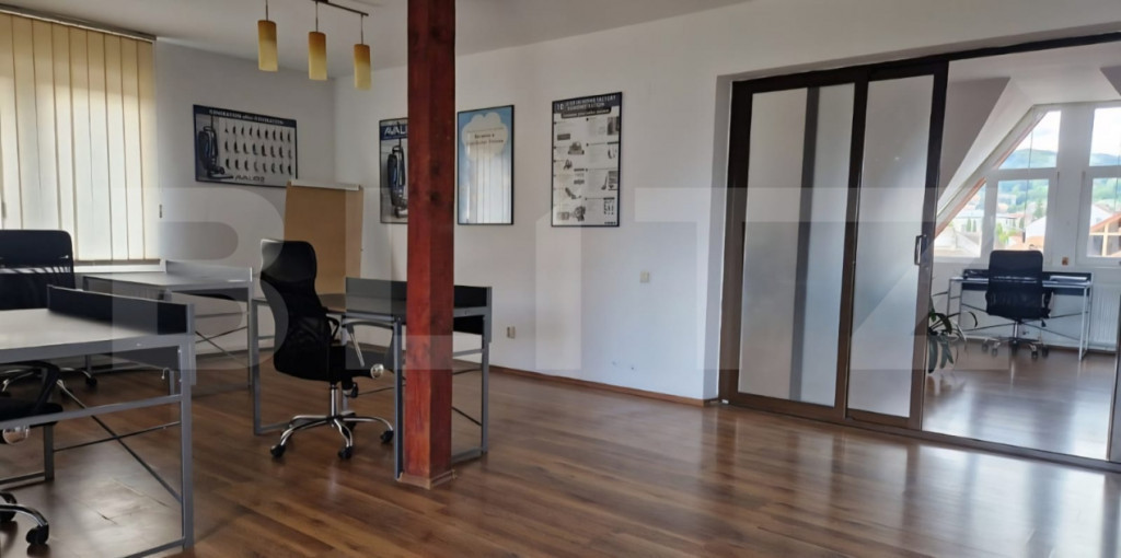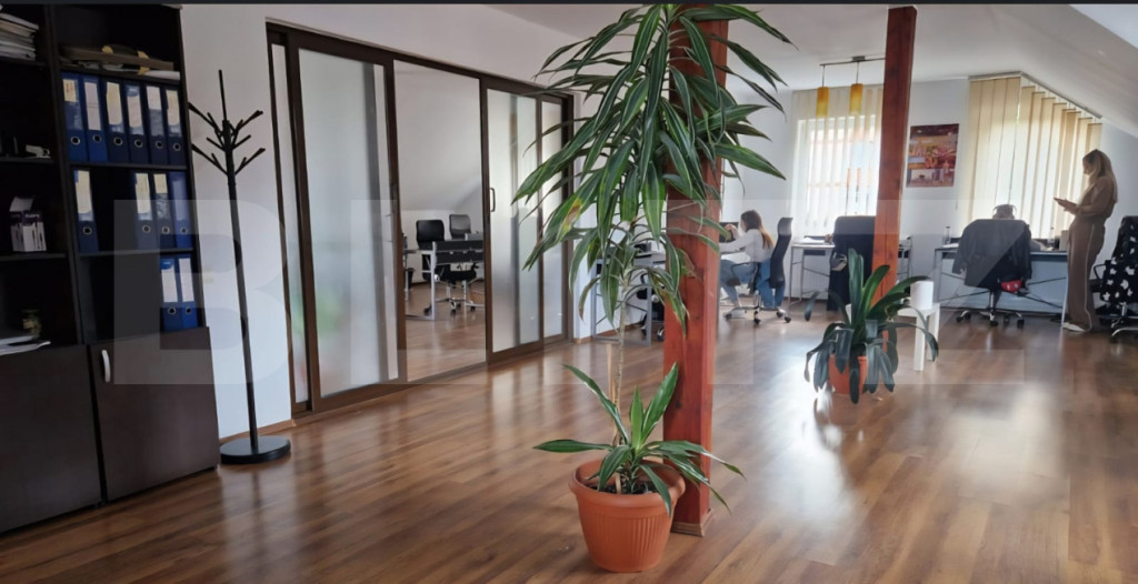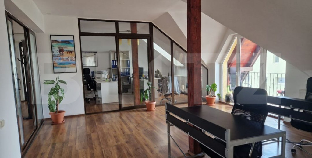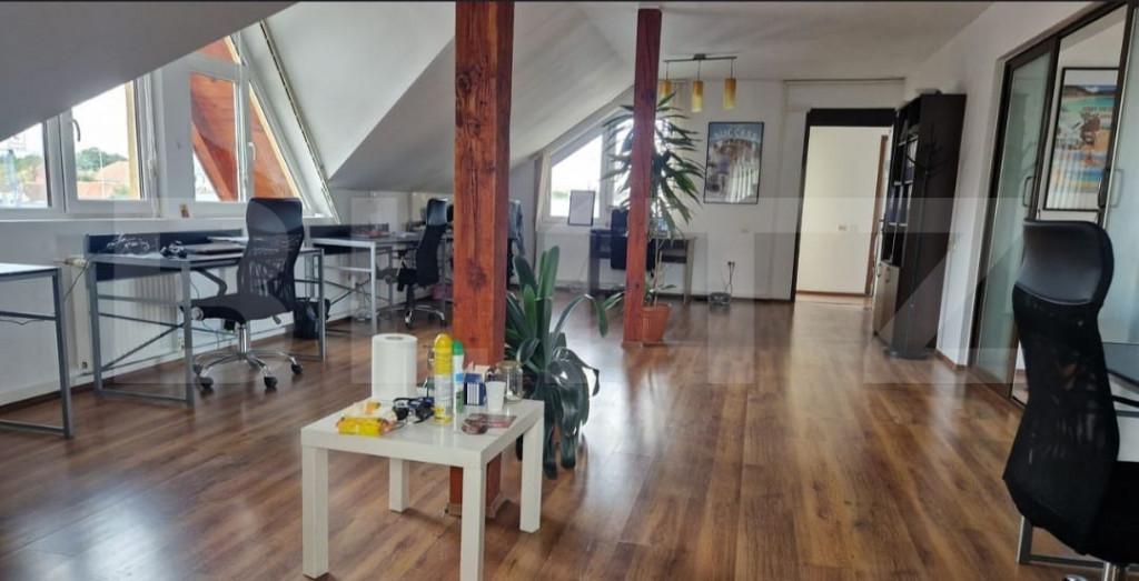 BLITZ vă prezintă spre închiriere un spațiu generos de 120 mp utili, situat la mansarda unei clădiri moderne, destinată închirierii pe termen lung. Spațiul se remarcă prin versatilitate și confort, fiind ideal pentru birouri, activități IT, call center, logistică sau alte domenii similare. Facilități: Grup sanitar propriu Centrală termică individuală Aer condiționat 4 locuri de parcare în curtea proprie Curte supravegheată video Utilități contorizate separat Amplasarea este una avantajoasă, într-o zonă ușor accesibilă, cu restaurante, hoteluri și supermarket Kaufland în imediata apropiere. Condiții financiare: Preț final, fără TVA Utilitățile se achită separat, în funcție de consum Cod ofertă / ID BLITZ: P156286 Id intern: P156286