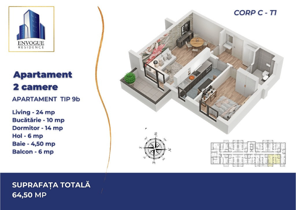 Fie că ești în căutarea unei locuințe pentru uzul propriu, fie că vrei să faci o investiție inteligentă, un apartament cu două camere rămâne una dintre cele mai viabile opțiuni pe care le ai la dispoziție. În ansamblul rezidențial EnVogue Residence - Iuliu Maniu, din vestul Capitalei, îți punem la dispoziție unități locative bicamerale cu suprafețe generoase, semnificativ peste media practicată în mod obișnuit pe această piață. Spre exemplu, apartamentul pe care ți-l propunem spre vânzare are o suprafață utilă de 64 metri pătrați. Programând o vizionare, vei descoperi că locuința despre care îți vorbim se distinge prin caracteristicile devenite deja obișnuință pentru clienții EnVogue Residence, anume calitatea și siguranța construcției, alături de finisajele din categoria premium. La suprafața generoasă a acestui tip de apartament se adaugă un alt avantaj important pentru potențialii cumpărători, anume compartimentarea sa inteligentă, respectiv faptul că este o unitate locativă decomandată – ceea ce credem că va contribui mult la sporirea confortului tău! PLUS-VALOARE: Ne străduim în permanență să punem la dispoziția clienților noștri cele mai bune oferte financiare, astfel că făcând o achiziție EnVogue Residence - Iuliu Maniu te vei bucura de următoarele beneficii: • Asistență GRATUITĂ, din partea unui broker de credite profesionist, pentru cei interesați de accesarea unei finanțări bancare. • Reducere de 10% la mobila din magazinul Mobexpert Militari, la cumpărarea oricărei locuințe în cadrul EnVogue Residence - Iuliu Maniu. Aflat în dezvoltare pe Bulevardul Iuliu Maniu, nr. 586-590, în imediata apropiere a stației de metrou Preciziei, EnVogue Residence - Iuliu Maniu aduce pe piață apartamente noi de calitate superioară, cu suprafețe și compartimentări variate – garsoniere, studiouri, apartamente cu două și trei camere, dar și penthouse-uri mai spațioase. Recent finalizată, prima fază de dezvoltare a proiectului (corpul C) cuprinde 169 de unități locative, în vreme ce faza a doua (corpul B) este aflată în derulare și cuprinde 214 apartamente. Locuințele din cadrul proiectului au suprafețe generoase, peste media practicată în mod obișnuit pe acest segment de piață, în vreme ce dotările și finisajele se încadrează în categoria premium, tocmai pentru a furniza rezidenților acel plus de confort pe care și-l doresc în propriile case. Dovadă a atenției deosebite acordate siguranței și confortului locatarilor, fiecare bloc din cadrul ansamblului EnVogue Residence - Iuliu Maniu include propriul adăpost de protecție civilă, amplasat la subsolul clădirii. De asemenea, dezvoltatorul a început deja instalarea de panouri fotovoltaice în cadrul proiectului, astfel că viitorii rezidenți se vor putea bucura de confortul și beneficiile unei surse de energie regenerabilă. Specificații și facilități: • Regim de înălțime de 10 etaje • Fundație de tip radier general, cu 2 subsoluri • Structură pe cadre de beton • Adăpost de protecție civilă pentru fiecare bloc • Panouri fotovoltaice • Certificat de performanță energetică de clasa A • Compartimentări interioare din cărămidă Porotherm • Izolație exterioară realizată din vată bazaltică și polistiren • Grad ridicat de protecție ignifugă • Sistem de termoizolație și hidroizolație de la Sika pentru terase • Spații verzi și zonă de promenadă • Locuri de joacă pentru copii • Spații comerciale, restaurant, sală de fitness, supermarket • Stații de încărcare pentru mașini electrice etc. Despre EnVogue Residence Cu o experiență de circa 9 ani pe piața rezidențială din Capitală și împrejurimi, portofoliul dezvoltatorului autohton EnVogue Residence cuprinde 5 proiecte finalizate și unul aflat în curs de construcție, anume EnVogue Residence - Iuliu Maniu. Printre obiectivele avute în vedere de companie se numără, în primul rând, siguranța și confortul locatarilor, alături de accesul facil la mijloacele de transport în comun, inclusiv metrou, respectiv către principalele puncte de interes ale orașului.