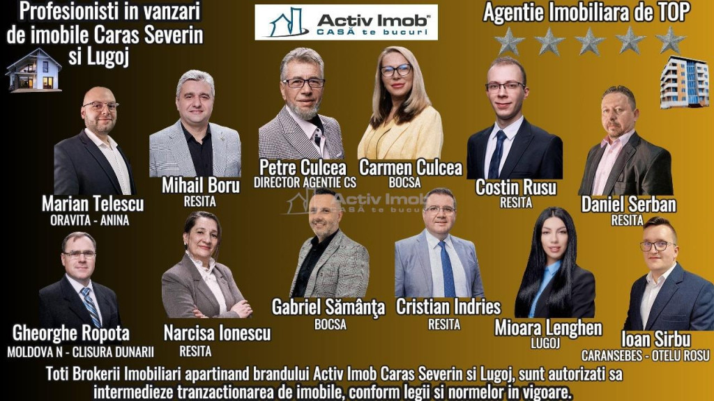 1. BENEFICII PENTRU CLIENTII ACESTEI OFERTE: - Apartamentul este situat la etajul 3, al unui imobil cu regim de inaltime, P 4 etaje, confort 1 decomandat, compus din 2 camere generoase si luminoase, (sufragerie si un dormitor mare cu balcon), 1 bucatarie spatioasa, 1 baie mare si un hol generos, totul la o suprafata construita de cca. 59 mp. - Apartamentul este situat Central, este foarte luminos si curat, are toate utilitatile, convector pe gaz in sufragerie, geamuri termopan, usa metalica la intrare, se preteaza pentru clientii care isi doresc sa renoveze dupa bugetul, dorintele si nevoile lor, un loc frumos, care sa devina...ACASA, unde sa isi creeze noi amintiri alaturi de familie. Scara este curata si administrata corect, cu locatari linistiti. - Amplasarea apartamentului este, cu siguranta, un factor foarte important. Acest apartament este situat central, intr-o zona cu multe gradini si spatii verzi intretinute, zona oferind acces facil catre toate punctele de interes ale orasului. In vecinatate se gasesc magazine, supermarketuri, scoli si gradinite, iar scara este foarte ingrijita, administrata corespunzator; - Apartamentul este luminos, aerisit si nu prezinta urme de mucegai sau miros neplacut. - Se vinde asa cum se vede in fotografii, pretul este usor negociabil. Compania ACTIV IMOB ROMANIA detine dreptul exclusiv de mediatizare a acestei proprietati, astfel intermedierea pentru vanzare-cumparare se va realiza doar prin si cu sprijinul acesteia, cumparatorul avand garantia ca tranzactia se va finaliza in siguranta si legal. Va multumim si va felicitam ca ati ales SIGURANTA TRANZACTIEI! 2. Beneficii oferite de zona: - foarte aproape de statii de autobuz in ambele sensuri; - la 1 min. de Supermarket PENNY si 3 min de Parabo ; - la 1 min. de mijloc transport in comun, centrul orasului, unde se gasesc farmacii, magazine, cofetarii, terase...etc.; - la 2 min. de scoala si gradinita; - la 2 min de Cabinete medicale si Corpul Administrativ Taxe si impozite al Primariei Bocsa. 3. Situatia juridica: Aceasta proprietate detine informatii reale, fiind verificata si evaluata in prealabil de Compartimentul Suport Back-Office. Detine contract de vanzare-cumparare, cadastru, intabulare si este liber de sarcini. 4. Unde se poate petrece timpul liber: - se afla in imediata apropiere a mai multor baruri si restaurante, precum si a unor farmacii si supermarketuri ( Parabo, Profi si Penny); - la 1 min. de zona MFA unde se gasesc restaurante, pizzerii, carmangerii, cafenele, spalatorii auto, terase, fast-food si diferite magazine; - la 2 min. de Institutii publice; - la 3 min. de locuri de joaca pentru copii; Daca si dumneavoastra aveti o proprietate in Resita sau in Judetul Caras-Severin si doriti sa o vindeti sau sa o inchiriati, va rugam sa sunati la numerele de telefon 0770 648 478 - Narcisa Ionescu sau 0784 726 875 - Petre Culcea si vom crea un profil personalizat pentru vanzarea sau inchirierea acesteia, vizibil pe singurul site de imobiliare al orasului: resita.activimob.ro. Va multumim! RECOMANDARE: PENTRU A VIZUALIZA TOATE OFERTELE SI A PRIMI NOTIFICARI CU NOILE OFERTE, VA RUGAM SA SOLICITATI CERERE DE PRIETENIE PE FACEBOOK, Petre Culcea ActivImob Resita SAU ACCESATI SITE-UL OFICIAL DE IMOBILIARE AL ORASULUI: resita.activimob.ro. MULTUMIM! Posibilitate cumparare prin credit ipotecar in 3 saptamani sau cash in 3 zile, documentatie executata de compartimentul Suport Back-Office din cadrul biroului.