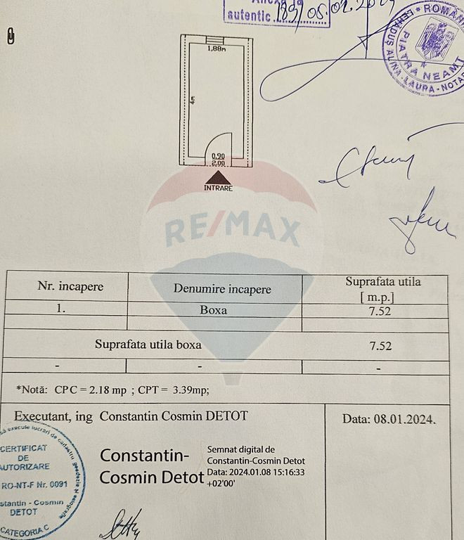Se oferă spre vânzare boxă situată pe Bulevardul Traian, într-o zonă centrală. Spațiul are o suprafață utilă de 7,52 mp, fiind ideal pentru depozitarea diverselor bunuri personale, echipamente sau obiecte sezoniere. Boxa este amplasată într-un imobil bine întreținut și oferă un acces facil, fiind potrivită atât pentru uz propriu, cât și ca investiție.