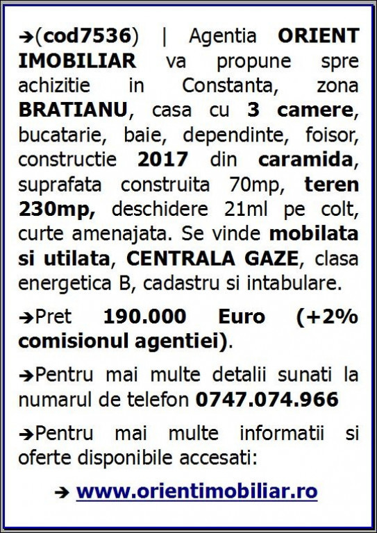 (cod7536) | Agentia ORIENT IMOBILIAR va propune spre achizitie in Constanta, zona BRATIANU, casa cu 3 camere, bucatarie, baie, dependinte, foisor, constructie 2017 din caramida, suprafata construita 70mp, teren 230mp, deschidere 21ml pe colt, curte amenajata. Se vinde mobilata si utilata, CENTRALA GAZE, clasa energetica B, cadastru si intabulare. Pret 190.000 Euro (+2% comisionul agentiei). Pentru mai multe detalii sunati la numarul de telefon 0747.074.966.