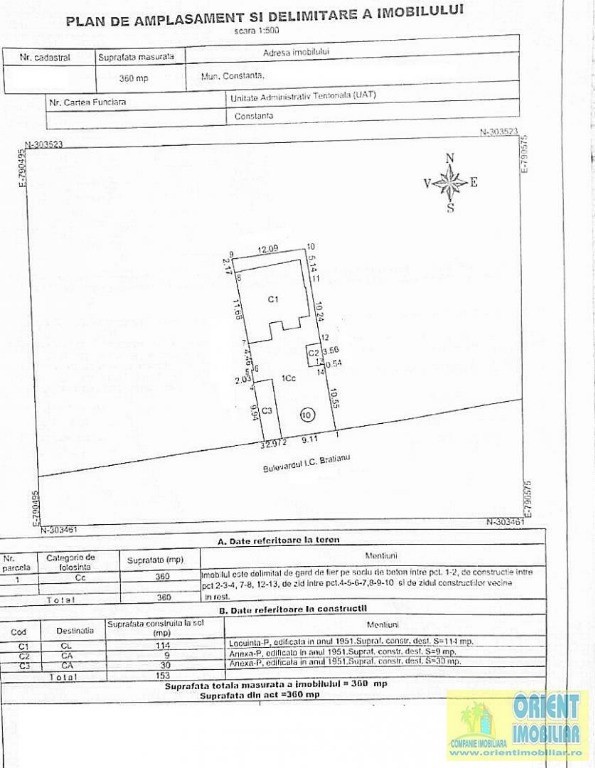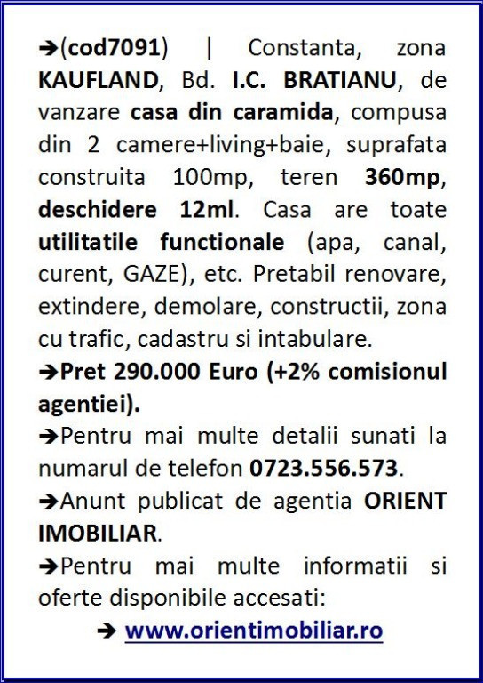 (cod7091) | Constanta, zona KAUFLAND, Bd. I.C. BRATIANU, de vanzare casa din caramida, compusa din 2 camere+living+baie, suprafata construita 100mp, teren 360mp, deschidere 12ml. Casa are toate utilitatile functionale (apa, canal, curent, GAZE), etc. Pretabil renovare, extindere, demolare, constructii, zona cu trafic, cadastru si intabulare. Pret 290.000 Euro (+2% comisionul agentiei). Pentru mai multe detalii sunati la numarul de telefon 0723.556.573. Anunt publicat de agentia ORIENT IMOBILIAR.