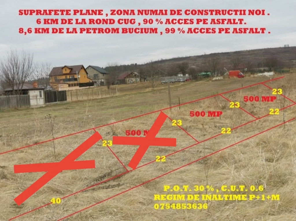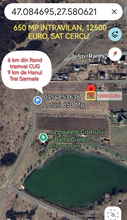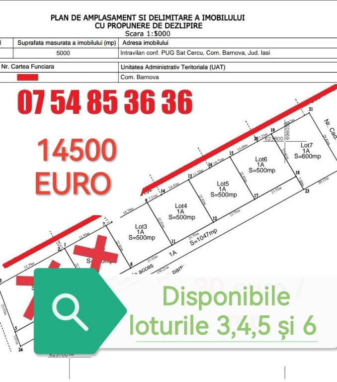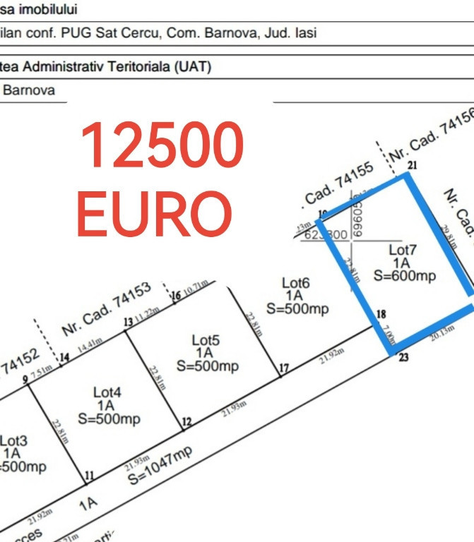 Relații suplimentare la 0754853636. Acte O.K. POT 30 %. CUT 0,6. Regim de înălțime P +1 +M. Suprafețe perfect plane. 650 mp intravilan sat Cercu comuna Bârnova județul Iași. Cotă de drum inclusă în preț. Preț începând de la 12500 euro lotul în funcție de parcelă și amplasament!