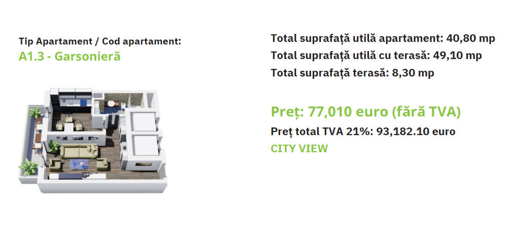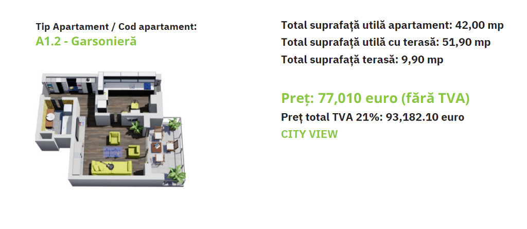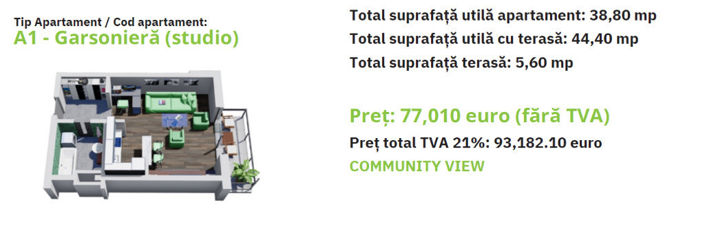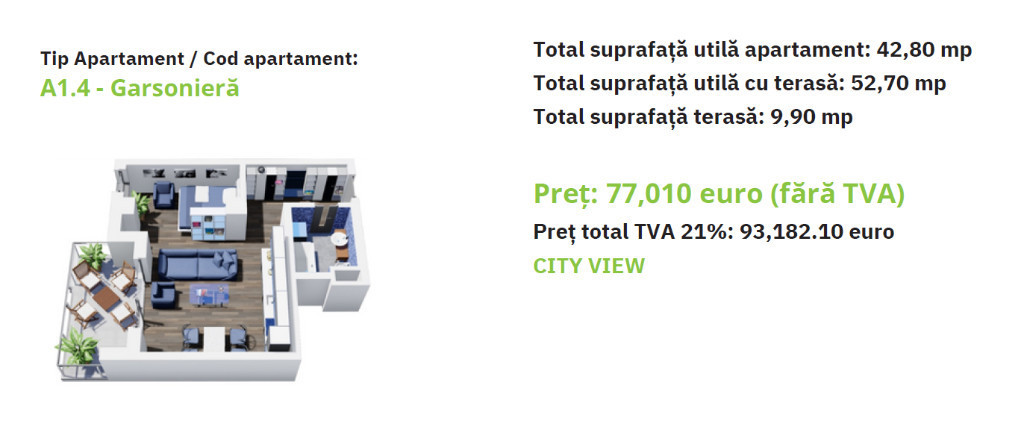 C/1556 Speed Imobiliare vă propune spre vânzare patru tipuri de apartamente cu o cameră, situate în complexul Green Residence, pe strada Livezeni, în cartierul Tudor. Apartamentele au suprafețe cuprinse între 44,40 și 52,66 mp și vor fi predate în martie 2026, în stadiul finisat complet. Fiecare apartament este dotat cu centrală proprie, încălzire în pardoseală, geamuri termopan, aer condiționat, balcon generos, ușă de intrare smart și toaletă cu funcții inteligente. Blocul este construit din cărămidă, izolat la exterior cu polistiren de 10 cm, și dispune de două ascensoare. Complexul este supravegheat video, asigurând un nivel ridicat de confort și siguranță. Locurile de parcare sunt disponibile la prețul de 5.000 euro + TVA (21%). Prețul de vânzare al apartamentelor este de 93.182 euro (TVA inclus), iar comisionul către agenție este 0%. Se acordă un discount de 5% pentru achitarea integrală a prețului în momentul semnării primului contract de vânzare-cumpărare, respectiv un discount de 2,5% pentru achitarea a 50% din preț în avans și 50% la semnarea contractului de vânzare-cumpărare final. Structura de rezistență a imobilelor este alcătuită din fundații de beton armat tip radier general și sistem constructiv în cadre din beton armat format din stâlpi, grinzi și planșee din beton armat, precum și diafragme, scări și atice din beton armat monolit. Regim de înălțime P+10 etaje. Planșeele au o grosime de 20 cm, iar înălțimea utilă a etajului curent este de 2,6 m. Fiecare apartament beneficiază de balcoane generoase tip terasă (conform specificațiilor fiecărui tip de apartament). Zidăria exterioară: Zidăria exterioară este din termoizolant YTONG. Peretrii exteriori sunt izolați cu un termosistem din polistiren expandat de 10 cm, peste care se aplică o masă de spaclu armata cu fibră de sticlă, urmată de tencuiala decorativă texturată în culorile alb și roșu. Peretii despărțitori dintre apartamente și spațiile comune sunt din zidărie termoizolantă cu grosime de 25 cm și diafragme de beton de 25 cm, iar pereți exterior din zidărie termoizolantă de 30 cm. Peretii neconstructivi (pentru compartimentările interioare) au grosimea între 20-25 cm. Tencuiala și vopseaua sunt lavabile, iar închiderea firidelor pentru instalații este realizată cu un sistem din gips-carton și izolație din vată minerală de 5 cm pentru confortul acustic. Tâmplărie exterioară: Tâmplăria exterioară este din profile Veka, pachet sticlă tripan, profile cu 6 camere si cu barieră termică oferind o izolație termică și fonică de cea mai bună calitate, culoare Antracit. Glafurile exterioare sunt din tablă în culoarea fațadei. Terasele/Balcoanele: Terasele sunt hidro și termoizolate, finisate în culorile fațadei, și pardosite cu plăci ceramice de înaltă calitate, au iluminat Led cu senzor de mișcare și prize. Balustrada de protecție este din inox cu parapet din panouri de sticlă, având înălțimea de 110 cm. Clădirea beneficiază de un sistem de supraveghere video a perimetrului clădirii, acces în immobile și parcare. Totodată accesul la etajele superioare se realizează cu 2 ascensoare de capacitate de 6 persoane fiecare, greutate maximă 630 kg. Fiecare apartament beneficiază de un loc de parcare exterior – neinclus în preț/ofertă. Finisaje generale: Ușa de intrare în apartament: Ușă HPL vopsit de grosime 5.2 cm cu închidere multipunct SMART (deschidere prin amprentă, recunoaștere facial, cod sau cheie), include un sistem SMART de video sonerie, izolată fonic, maner Gun Grey, toc și pervaz MDF vopsit până în tavan. Uși interioare: Uși moderne, lisse (pline), din MDF vopsit, grosime de 40mm, cu toc reglabil, pervaze pe ambele părți, 3 balamale reglabile, garnitură, broască și maner negru de calitate superioara. Utilități: Apartamentele sunt contorizate individual și sunt racordate la rețeaua electrică și de gaze naturale. Conexiune la rețeaua de fibră optică (FTTH - fiber-to-the-home) prin rețeaua DIGI. Instalații termice: Fiecare apartament dispune de o centrală termică proprie în condensare Ariston 25KW, cu încălzire în pardoseală. Centralele în condensare oferă un consum redus de energie, cu până la 30% mai puțin față de o centrală standard, datorită randamentului mai ridicat. Finisaje interioare: Holuri: Peretii și tavanele sunt zugrăvite în alb cu vopsea lavabilă, iar pardoseala este placată cu parchet laminat de înaltă calitate. Fiecare apartament este dotat cu distribuitor-colector pentru încălzire în pardoseală, tablou electric, comutator si 2 termostate. Bucătării: Peretii sunt zugrăviți în alb. Pardoseala este placată cu parchet laminat. Bucătăriile sunt dotate cu centrală termică, încălzire în pardoseală, instalație de gaze, senzori de gaze, prize simple și duble. Livinguri: Peretii și tavanele sunt finisate cu glet și zugrăvite în alb. Pardoseala este din parchet laminat de 10 mm grosime. Livingurile sunt dotate cu, instalație TV, prize internet și prize TV.