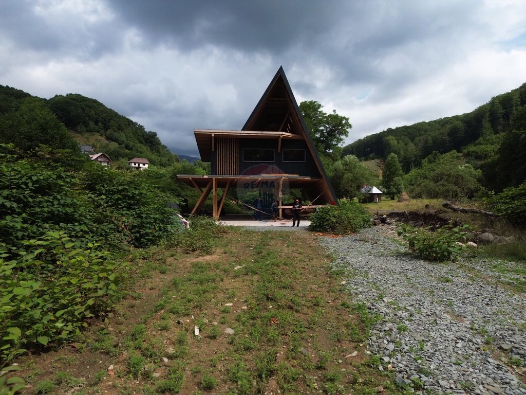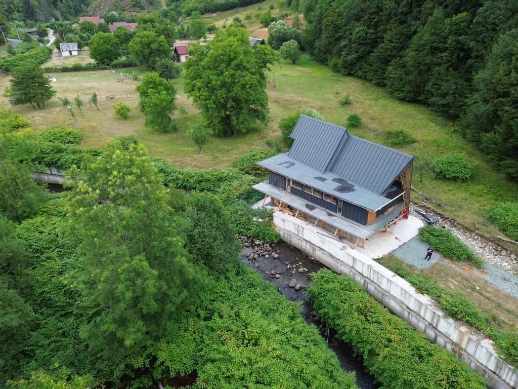 Cabana A-frame Modernă – 312 m² situata intre un rau si padure si la o distanta de doar 100 m de drumul principal accesul facanduse pe un drum privat unde exista cota parte Această cabană impunătoare îmbină farmecul clasic al formei triunghiulare cu confortul și funcționalitatea designului modern. Fațada sa spectaculoasă, realizată din tabla si sticlă pe toată înălțimea, lasă lumina naturală să inunde interiorul și deschide priveliști panoramice către natură. Construită pe două niveluri spațioase, cabana oferă: Living open-space cu tavan înalt și șemineu central, ideal pentru seri relaxante. Bucătărie modernă cu insulă și zonă de dining. 4 dormitoare luminoase, fiecare cu acces la terasă sau balcon, 3 băi Exteriorul este completat de 2 terase generoase din care se poate pescui direct in rau, perfectă pentru socializare, și o zonă de grătar. Structura din lemn lamelar și metal asigură rezistență, iar izolația cu vata minerala modernă o face confortabilă pe tot parcursul anului. Aceasta nu este doar o cabană — este o experiență de viață, în care simplitatea liniilor se împletește cu eleganța detaliilor. Pentru nmai multe detalii si vizionari va stau la dispozitie. Ioan Cupcea Consultant imobiliar tel 0722600023