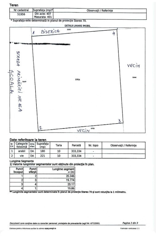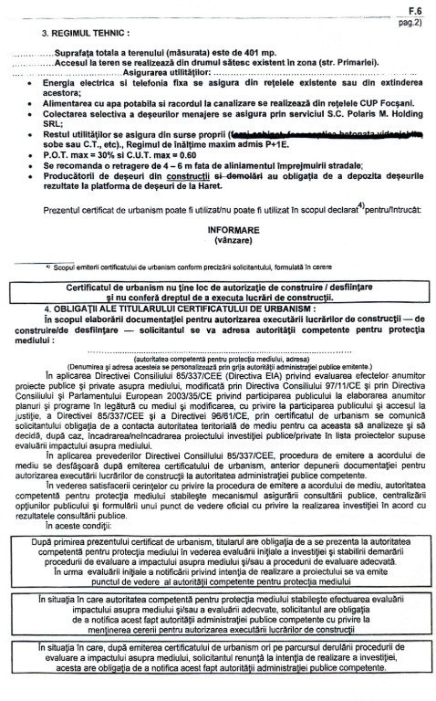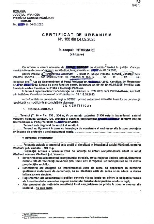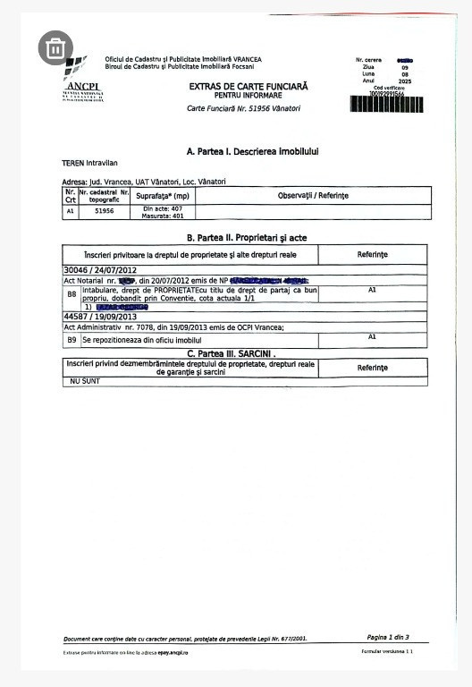 Cadou de la Moș Nicolae! Reducere de la 100€ la 85€/mp. Doar pe 05 și 06 decembrie 2025!!! Visezi la un loc liniștit, departe de zgomotul orașului, cu dor de plajă, dor de mare? Se vinde în localitatea Vânători, județul Vrancea, terenul intravilan în suprafață de 401mp, cu o deschidere de 20.346 ml. - Adresă imobilului: strada Primăriei nr 16 A - Toate utilitățile sunt la poartă: curent electric, apă, canalizare, cablu TV, iar în viitorul apropiat și gazele. - Strada este asfaltată. - Acces rapid la toate punctele de interes din comună: grădiniță, școală, primărie, poliție, farmacie, cabinet medical,, biserica gard comun cu proprietatea, situate la 1-2 minute de mers pe jos. - Ideal pentru construirea: clădire de birouri, magazin, cabinet medical, farmacie, cofetărie. De asemenea, este pretabil a se construi o casă de vacanță sau o locuință, rămânând și teren pentru amenajarea unei grădinițe pentru destindere! - Ne aflam la 7 km de centrul municipiului Focșani, și la 3 km de intrarea pe autostrada A7. Punctul de atracție al zonei este plaja Putna situată la 800m/ 10 minute de mers pe jos, într-un cadru natural deosebit, pe malul Putnei. De asemenea, în apropiere este și complexul turistic Stone Park Vânători (piscină, bar). Acte la zi, intabulat, fără sarcini, extras de carte funciară pentru informare în galeria foto. Conform Certificatului de Urbanism pentru informare terenul are destinație „curți construcții” cu regim de înălțime P+1E, Procent de ocupare teren P.O.T. max. 30%, coeficient utilizare teren C.U.T 0, 30 ( atașat în galeria foto. Prețul este de 100 euro/mp. Comision (0) zero pentru cumpărător adresandu-vă direct proprietarului!