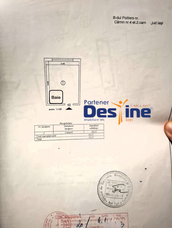 DESTINE IMOBILIARE vă prezintă spre vânzare: Cameră de cămin – cartier FRUMOASA, bdul. POITIERS Preț: 35.900 Euro Informatii utile despre proprietate: - Imobil neîncadrat cu risc seismic - Suprafață utila totala de 16 mp - Etaj 2 - / imobil cu 4 etaje Avantajele cheie ale locuinței: - Mobilat si utilat complet - Tâmplărie din PVC cu geam termopan - Baie proprie utilată cu cabină pentru duș - Bucătărie deschisă utilată in totalitate Imobilul este situat excelent in cartier, in proximitatea sa fiind toate punctele de interes din zona (școli, grădinițe, transport în comun, diverse magazine comerciale). Se vinde mobilat exact ca in fotografii, este liber de sarcini iar documentația este la zi. Nu lăsa pe mâine, ce poți cumpăra astăzi. Toni Galu – 0736.84.84.88 Cod ofertă: P - 4527 !!!Obține creditul dorit mai simplu ca niciodată!!! Nu mai alerga pe la toate băncile. Noi facem treaba în locul tău, absolut GRATUIT. Primești asistență personalizată de la dosar până la aprobare, indiferent de tipul de credit ales. Economisește timp și bani. Contactează-ne acum pentru o analiză gratuită! Id intern: P4527
