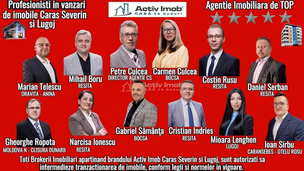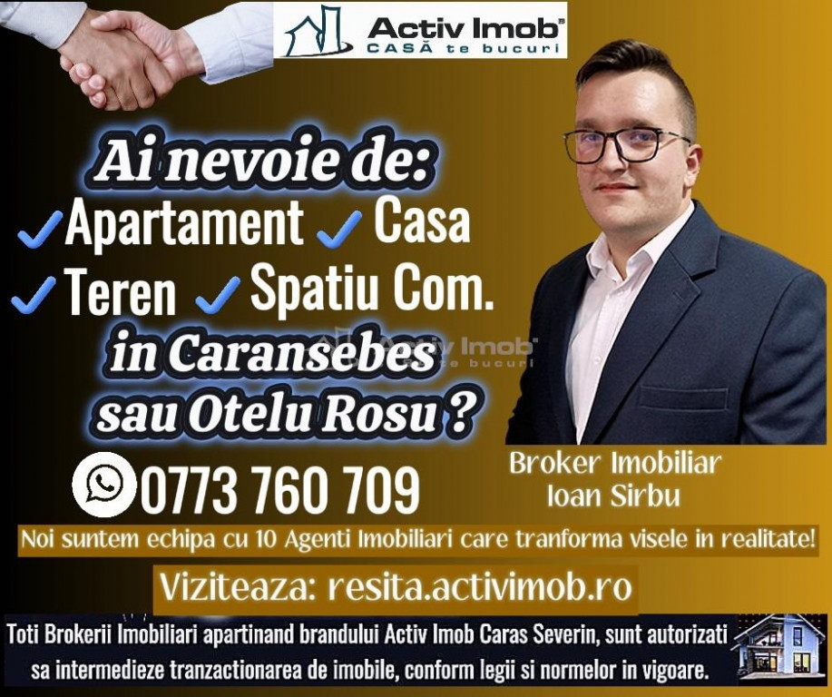 - Apartamentul este situat la etajul 1, al unui imobil cu regim de inaltime, P 4 etj., confort 1 sporit, decomandat, compus din 3 camere; (1 living generos si 2 dormitoare mari si luminoase), 1 bucatarie mare, open-space, cu spatiu de servit masa si 1 balcon mare inchis in termopan, mobilata si utilata; 2 bai (1 dotata cu cada), 1 alt balcon mare inchis in termopan, deschis in dormitor, totul la o suprafata construita de cca. 84 mp; - Apartamentul este foarte luminos si curat, aerisit, amenajat frumos, simplu si cu bun gust, are instalatia electrica schimbata, detine centrala termica si calorifere, geamuri termopan, usa metalica la intrare, usi interioare noi, parchet laminat de calitate, in camere si holuri, gresie si faianta in bai si bucatarie, aer conditionat, loc de parcare platit! - Amplasarea apartamentului este, cu siguranta, un factor foarte important. Acest apartament este situat in zona care ofera acces facil catre punctele de interes ale orasului. In vecinatate se gasesc magazine, supermarketuri, scoala si gradinita; - Blocul din care face parte apartamentul este amplasat intr-o zona linistita din cartierul Pipirig langa Penny, imobilul este foarte bine administrat, iar scara este foarte curata si administrata corespunzator, la parterul imobilului se regaseste si o debara proprie -Se vinde mobilat si utilat, exact cum se observa in fotografii, pretul este negociabil. Daca si dumneavoastra aveti o proprietate in Caransebes si Otelu Rosu, sau oriunde in Judetul Caras-Severin si doriti sa o vindeti sau sa o inchiriati, va rugam sa sunati la numerele de telefon 0773 760 709 - Ioan Sirbu sau 0726 204 150 - Costin Rusu si vom crea un profil personalizat pentru vanzarea sau inchirierea acesteia, vizibil pe site-ul de imobiliare al tuturor carasenilor. 2. Beneficii oferite de zona: - proprietatea se afla intr-o zona linistita din cartierul Pipirig, cu strazi asfaltate si iluminat stradal; - in imediata apropiere de statie mijloc transport in comun, scoala, gradinita; - la 5 min de complexul comercial de magazine Lidl, Kaufland, Pepco; - in imediata apropiere de strada principala unde se gasesc farmacii, restaurante, brutarie, fast-food, laboratoare medicale; 3. Situatia juridica: Aceasta proprietate detine informatii reale, fiind verificata si evaluata in prealabil de Compartimentul Suport Back-Office. Detine contract de vanzare-cumparare, cadastru, intabulare si este liber de sarcini. 4. Unde se poate petrece timpul liber: - in apropiere de strada principala unde se gasesc restaurante, pizzerii, cafenele, terase, fast-food si diferite magazine; POSIBILITATE CUMPARARE PRIN CREDIT IPOTECAR in 3 saptamani si cash in 3 zile, documentatie executata de compartimentul Suport Back-Office din cadrul biroului! ID: 231090