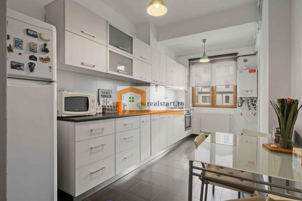 Priveliste placuta - Confort placut (fonic, termic, design) - Cheltuieli de Intretinere lunara mici - Complet Mobilat si Utilat Va prezentam un apartament cald, luminos, complet mobilat si utilat, situat la etajul 6 din 8, disponibil pentru mutare imediata. Dintre avantajele acestei proprietati: - se bucura de o buna luminozitate naturala, zonele vitrate fiind mari si avand totodata si o pozitie cardinala optima - orientare S-E - privelistea terasei apartamentului o consider punctul forte al proprietatii - existand acces atat din bucatarie, cat si din zona de living, iar view-ul oferit fiind cu adevarat deosebit indiferent de vreme sau anotimp, fiind neobturat de alte cladiri inalte si orientat catre o zona de case nou construite. - blocul in care se afla apartamentul este ingrijit, iar ca pozitie este optim amplasat: retras de zgomotul si poluarea stradala, insa aproape de toate facilitatile zonei: vis a vis este un parculet, iar la 2-3 min de mers pe jos exista o mini-piata, magazine diverse (Penny, Mega, farmacii), sala de sport, scoli si gradinite si acces facil catre mijloace de transport - apartamentul are cheltuieli mici de intretinere - si se bucura de un foarte bun confort termic si fonic - locul de parcare al acestui apartament se afla langa intrarea in bloc - se poate vedea direct din terasa (insa, nu este inclus in pret; se poate cumpara separat) - exista o ampla dezvoltare urbanistica si a infrastructurii a zonei - insa fara riscul aparitiei de santiere sau constructii de blocuri noi in imediata vecinatate a blocului in care se afla apartamentul Mobilierul si aparatura electrocasnica se afla intr-o buna stare, pretul de vanzare nu include mobilierul detasabil si paratura electrocasnica. Portofoliul foto este de data recenta. Se poate achizitiona si prin credit ipotecar bancar. Pentru mai multe informatii va stau la dispozitie telefonic sau in timpul intalnirii pentru vizionarea proprietatii.