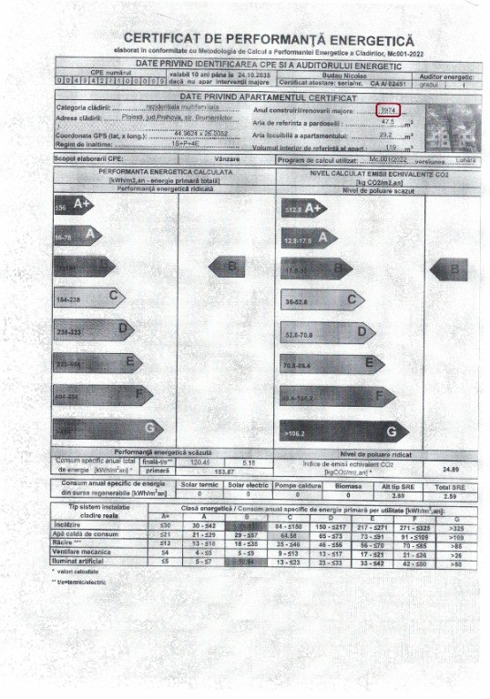 DIRECT PROPRIETAR !!! ZERO COMISION !!! Preț de vânzare: 53.000 euro Apartament 2 camere, Ploiești – Cartier Nord, strada BRUMARELELOR situat la etajul 4 din 4, într-un bloc construit în anul 1974, din beton armat, solid și foarte bine întreținut, localizat în imediata apropiere a Spitalului Județean Ploiești, locația este una excelentă, în cartierul Nord, o zonă liniștită și aerisită, cu parcuri, spații verzi, acces rapid la transportul public către toate zonele de interes din oraș, Liceul Tehnologic de Servicii „Sfântul Apostol Andrei”, Grădinița cu program prelungit „Raza de Soare” și centrul comercial Funshop Park. Imobilul este izolat termic la exterior, iar apartamentul este poziționat pe mijloc, oferind confort termic sporit și fără probleme de plafon, infiltrații sau alte deteriorări. Baia beneficiază de geam pentru aerisire naturală. Apartamentul are o suprafață utilă de 47,5 mp (suprafață totală 53,5 mp incluzând balconul de 6 mp) și este compartimentat astfel: Hol principal – 2,6 mp, Bucătărie – 6,0 mp, Cămară – 1,4 mp, Debara – 0,7 mp, Sufragerie – 16,1 mp, Hol secundar – 1,9 mp, Baie – 4,2 mp, Debara – 1,5 mp, Dormitor – 13,1 mp, Balcon – 6,0 mp. Apartamentul se află într-o stare excelentă, recent renovat, dispunând de: Centrală termică proprie nou instalată (nefolosita), Aparat de aer condiționat nou (nefolosit), Ușă metalică la intrare, Uși interioare schimbate (noi), Gresie și faianță nou montate, Zugrăveală integrală proaspătă cu vopsea lavabilă, obiecte sanitare nou instalate (nefolosite). Conform certificatului de performanță energetică, apartamentul se încadrează în clasa energetică B, având un consum anual total de 120,45 kWh/m²·an, ceea ce indică un nivel bun de eficiență termică și costuri reduse de întreținere. Ideal pentru locuire permanentă sau investiție, apartamentul oferă o poziție excelentă, confort termic și o compartimentare echilibrată.