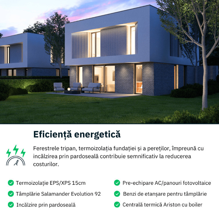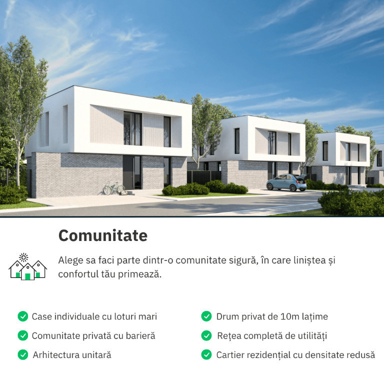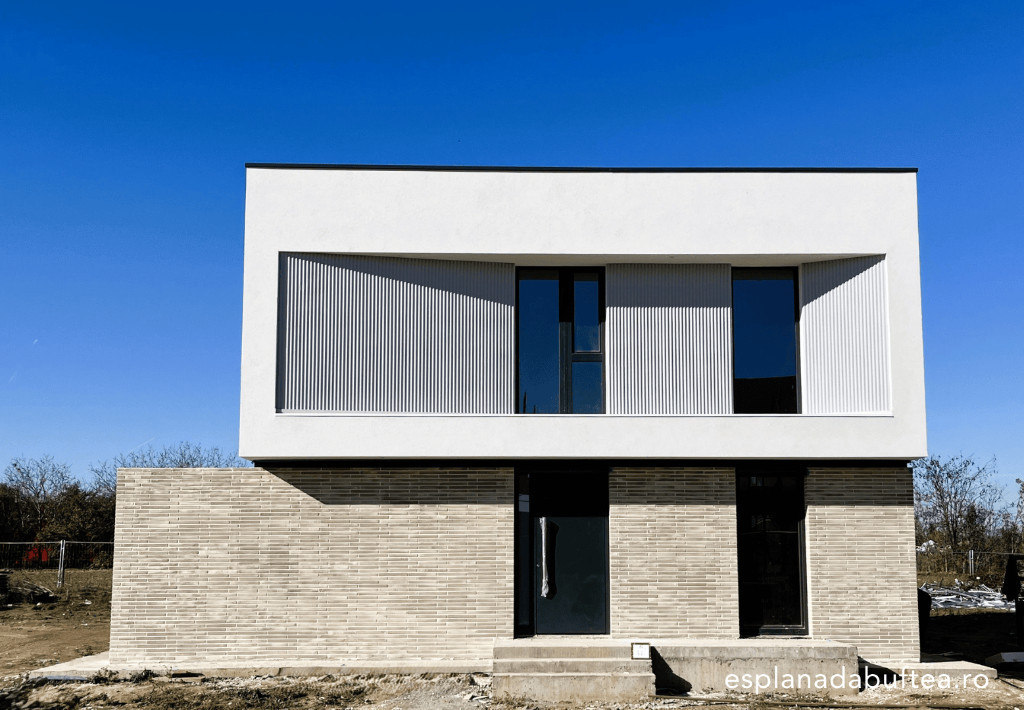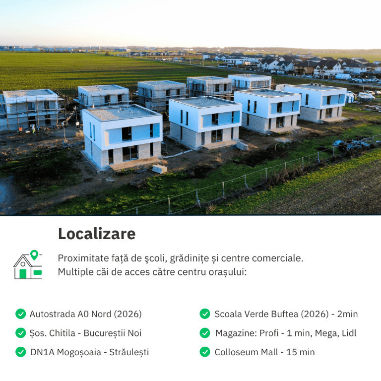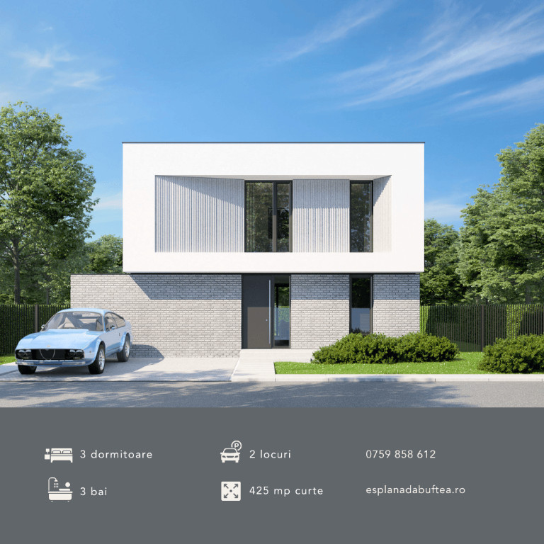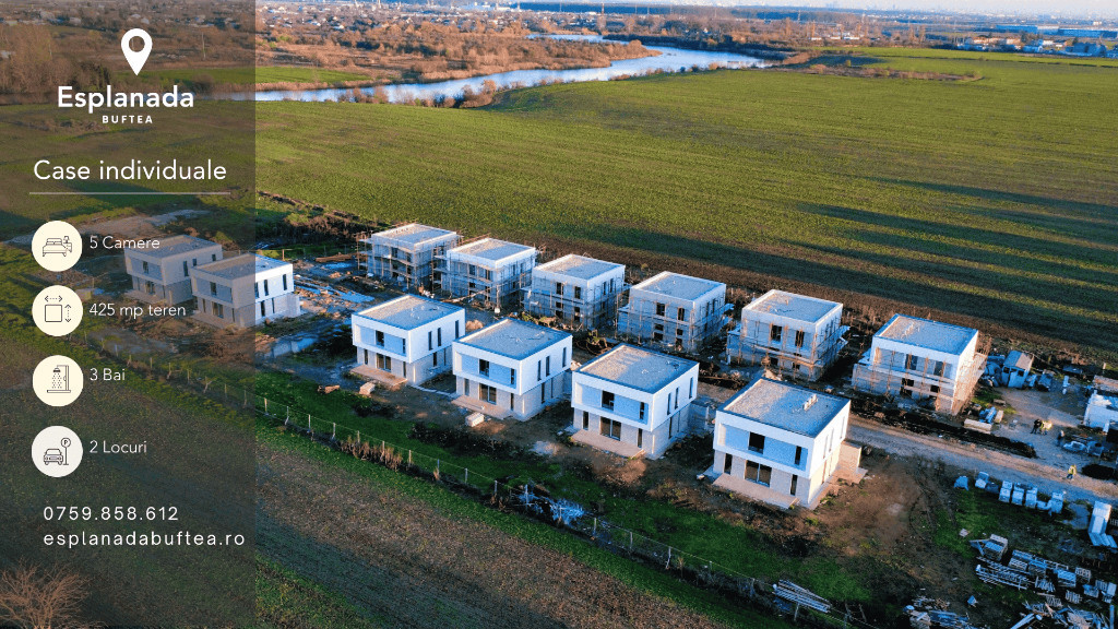 Esplanada Buftea - Cartier rezidential - Str Indepententei Buftea Construim 12 case individuale P+1 cu termen de finalizare in 2026. Casele vor fi complet racordate la rețelele utilitare iar accesul in comunitate sa va realiza direct din Strada Independentei printr-un drum privat de 7 m lățime cu trotuare de 1.5 m pe fiecare latura. In fazele următoare vom extinde cartierul prin construcția caselor unifamiliale, a zonelor comerciale si de agrement. Asiguram o abordare modulara a dezvoltărilor ulterioare prin multiple intrări separate din Strada Independentei, astfel încât viitorii proprietari se vor bucura de liniște si confort încă din prima zi in Esplanada Pret începând de la: 240,000 EUR + TVA Comision 0% - direct de la dezvoltator Specificații tehnice casa individuala P+1 • Dimensiune loturi intre 407 si 425 mp • Suprafața construita: 165 mp • Suprafața terase exterioare: 24 mp • 2 locuri de parcare amenajate • 5 camere: 3 dormitoare, birou si living open-space • Termoizolație fundație, soclu, fațada si acoperiș: 15-20cm • Hidroizolație bituminoasa in strat dublu fundație, soclu si acoperiș terasa • Fațada din cărămidă aparenta la parter iluminata arhitectural • Încălzire prin pardoseala, centrala termica gaz Ariston cu boiler • Tâmplărie PVC Salamander BluEvolution 92 cu 6 camere, pachet cu 3 foi de sticla tratament lowe /4S. • Instalație electrica trifazica cu întrerupătoare si prize, împământare si paratrăsnet • Pregătire montaj panouri fotovoltaice si aparate AC. • Bariera la intrare în cartier: acces controlat pentru securitatea rezidenților. Conectivitate si infrastructura. • Conexiune cu Autostrada de centură a Bucureștiului A0 - Cartierul Esplanada se află la 3 minute de viitorul nod rutier dintre A0 Nord și Șoseaua Chitila. Multiple cai de acces către centrul orașului: • Calea 1: Sos. București – Târgoviște, Mogoșoaia – Străulești • Calea 2: Sos Chitila – Bucureștii Noi • Calea 3: Drumul radial 4 Nord Expres: Tamași – Bld. Poligrafiei