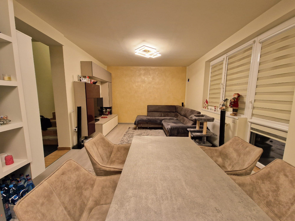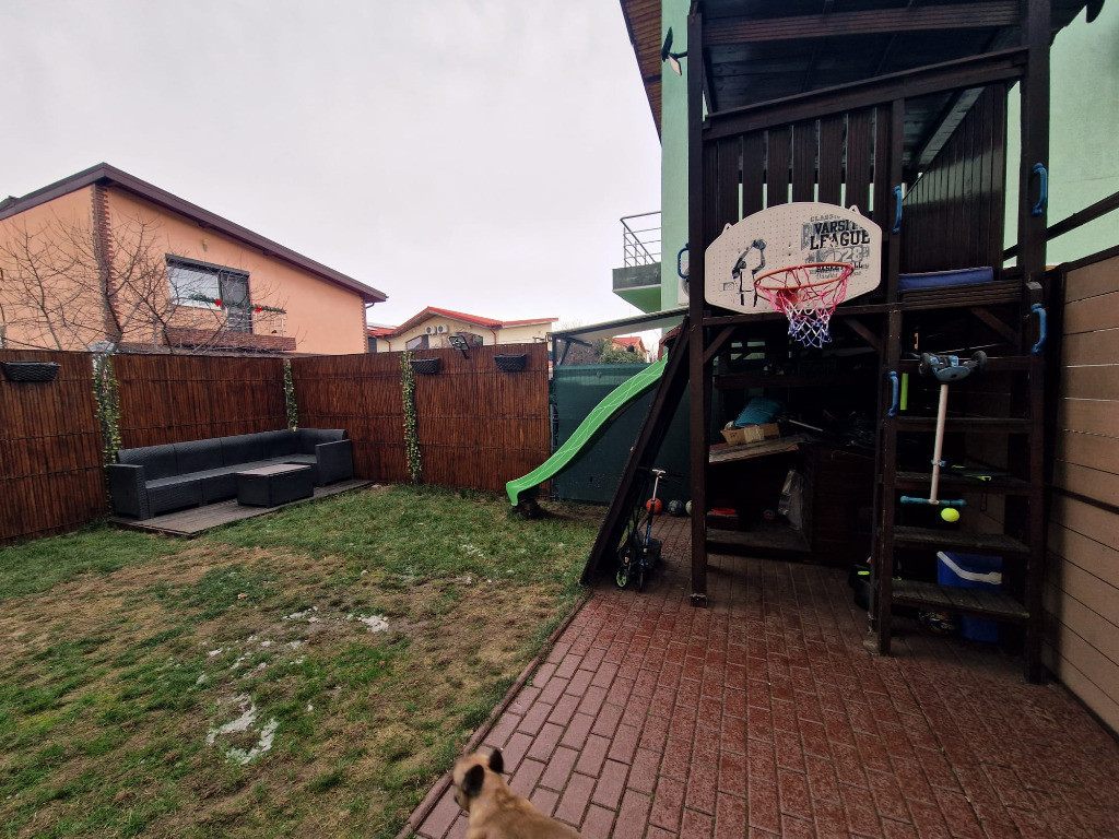 casa 115mp 4 camere / 3 bai P+1+M casa se vinde ca in poze , complet mobilata si utilata. 4 tv led , centrala ariston , 2 aer conditionat ( etaj si mansarda) Parter: sufragerie , bucatarie , baie , hol etaj: hol , baie , 2 dormitoare , balcon inchis. Mansarda: baie , dormitor / loc de joaca / open space. parcare privata in curte comuna inchisa , intrare cu telecomanda curte:82mp loc de joaca (casuta din copac) topogan / cos de baschet casuta caine cu incalzire si termostat terasa amenajata in fata casei loc de gratar foisor inchis si incalzit alarma pe 2 zone traseele pentru 4 camere trase sub casa scarii multe spatii de depozitat.