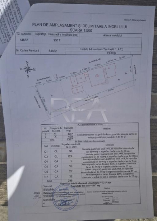 0% comision R.E.A. Imobiliare va propune spre vanzare o casa cu 6 camere P+1+Pod in comuna Peris, Ilfov pe strada Anton Pann + teren in proprietate 1317m.p. Casa a fost construita in 2008 pe structura de beton, planseu de beton intre etaje si pereti de BCA, dispune de izolatie de 10cm. Are o amprenta de 129m.p. si este impartita pe 2 etaje precum urmeaza: La parter livingul din care se face accesul catre bucatarie, cele 2 dormitoare si baie + scara interioara. La etaj se regaseste un al doilea salon/living cu acces catre terasa, hol cu iesire catre terasa, din care se face accesul catre cele 3 dormitoare. Terasa are aproximativ 25mp. Suprafata utila totala 215m.p. Suprafata utila per etaj 107,50mp. Terenul este impartit precum urmeaza: 897 m.p. curti si constructii 420 m.p. teren arabil Pe cei 897 m.p. s-au construit inca alte 5 anexe/constructii: O casa construita in 1970 din paianta cu amprenta 60mp. O camera tehnica cu amprenta 9mp. 3 magazii din care doar una cu acces catre beci in suprafete de 27mp, 32mp, 39mp. toate pe structura usoara. Toate aceste constructii impreuna cu constructia principala ocupa 296m.p. => TEREN LIBER/CURTE LIBERA ramasa 1010m.p. din care 420m.p. terenul arabil. Casa poate fi eliberata de mobila complet. La momentul prezent dispune de fosa, dar si de canalizare, necesita racordare. De asemenea, gazele sunt la poarta, necesita racordare. Confortul termic este realizat prin intermediul caloriferelor conectate la centrala termica pe lemne. Detaliile de ordin tehnic au caracter orientativ, acestea fiind preluate direct de la proprietar. Pentru alte detalii si vizionari ne puteti contacta mentionand codul proprietatii: P10942 Id intern: P10942
