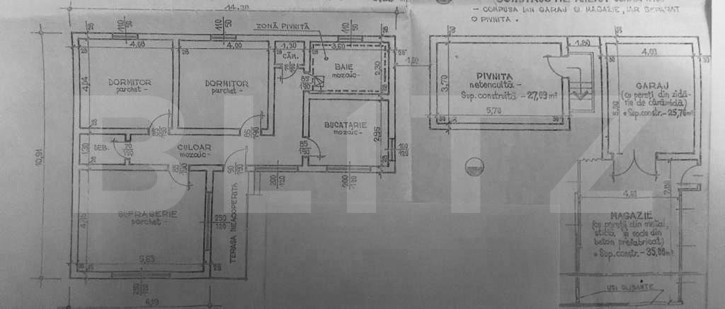 Blitz ofera spre vanzare casa cu 3 camere in zona Dorobantul, construita in anul 1972, cu fundatie de beton, pereti din caramida, planseu din beton, acoperis de tabla. Este amplasata pe un teren cu o suprafata de 510 mp, cu deschidere de 30 ml. Casa dispune de 2 beciuri, 2 garaje, sobe si calorifere, terasa neacoperita, parchet, mozaic in baie si bucatarie, apa, canalizare, gaze, curent electric, centrala termica. Este amplasata intr-o zona linistita, cu drum privat de acces, in apropiere de statii pentru mijloacele de transport in comun, supermarketuri, scoala si gradinita. Cod ofertă / ID BLITZ: P14060 Id intern: P14060