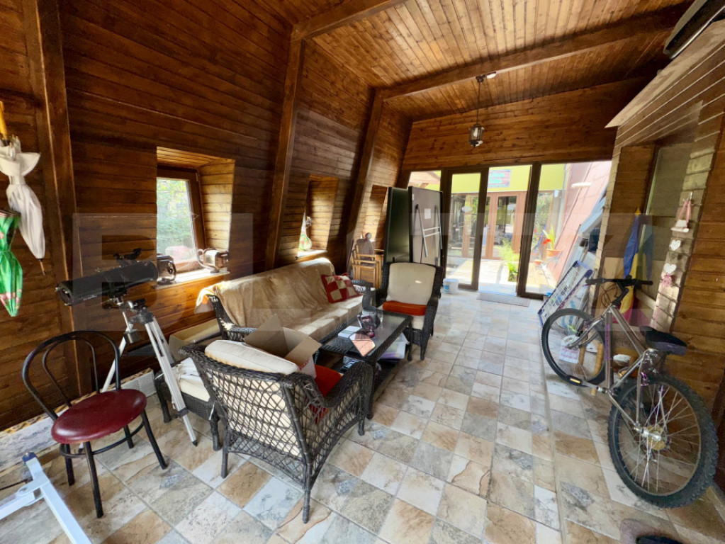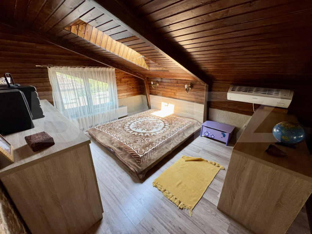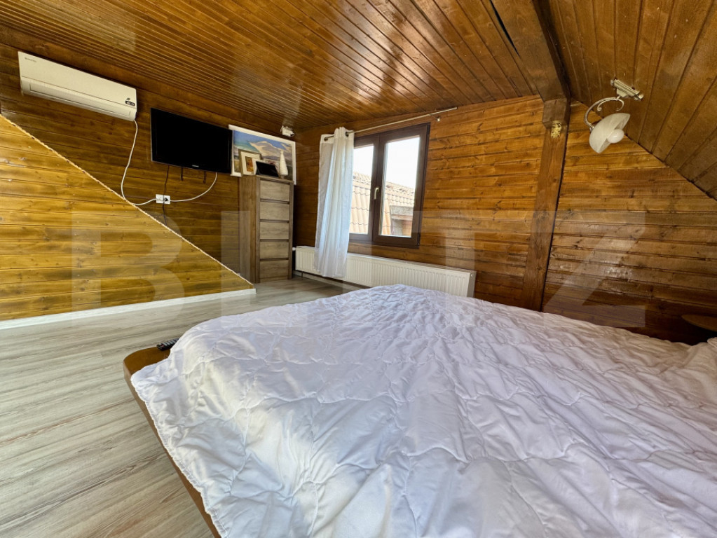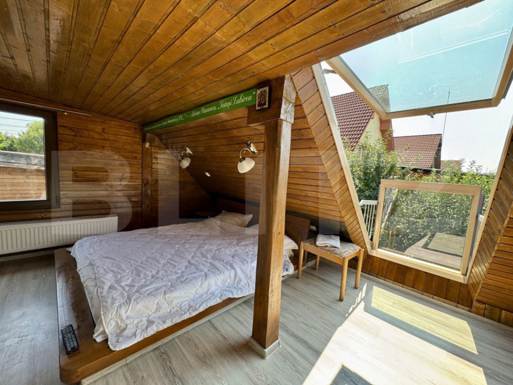 BLITZ vă propune spre închiriere un ansamblu de două case construite pe structură de lemn, cu o atmosferă de vacanță, ideal pentru relaxare și confort, situat pe un teren generos de 600 mp situat pe strada Diana nr. 12. Proprietatea principală, cu o suprafață de aproximativ 80 mp utili, este dispusă pe parter și mansarda. La parter regăsim un living open space cu bucătărie complet utilată (plită, cuptor, frigider, mașină de spălat vase și rufe), un dormitor, o baie, o cămară practică cu acces către zona piscinei și un șemineu funcțional pentru serile răcoroase. Mansarda oferă un spațiu ideal pentru birou, un dormitor open space și un dormitor închis. Casa este dotată cu sisteme de aer condiționat și sistem de alarmă monitorizat de firma de securitate NEI. A doua construcție, cu o suprafata aproximativa de 60mp destinată activităților de recreere, sau se poate inchiria in regim hotelier, aceasta dispune la parter de o piscină spațioasă, zonă de grătar, baie cu duș și spațiu de luat masa. La mansarda se află o cameră dublă cu aer condiționat, TV și balcon propriu. Încălzirea este prin pardoseală la parter și prin calorifere în dormitoare. Curtea oferă numeroase facilități suplimentare: un garaj pentru doua masini, o sera pentru legume, un iaz cu pești exotici și o fântânită decorativă, completând perfect cadrul natural și relaxant al proprietății. Din totalul terenului, 250 mp sunt spațiu liber, ideal pentru activități în aer liber. Va astept la vizionare Cod ofertă / ID BLITZ: P149684 Id intern: P149684