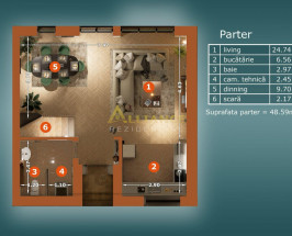 - parter : Living generos, cu acces direct la terasa si curtea privata, bucatarie spatioasa, baie, camera tehnica;