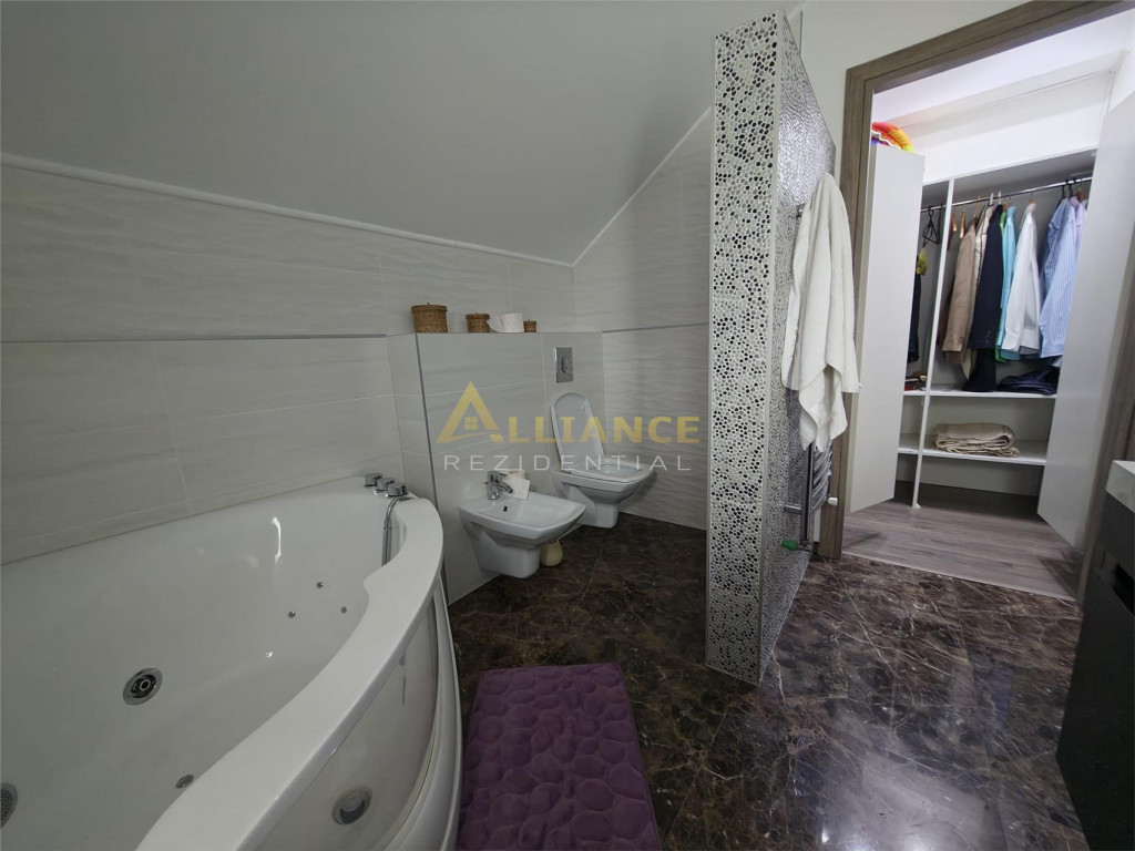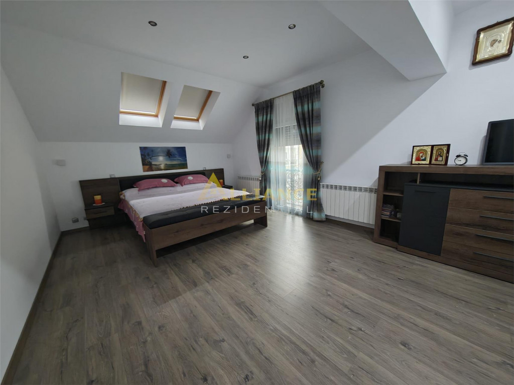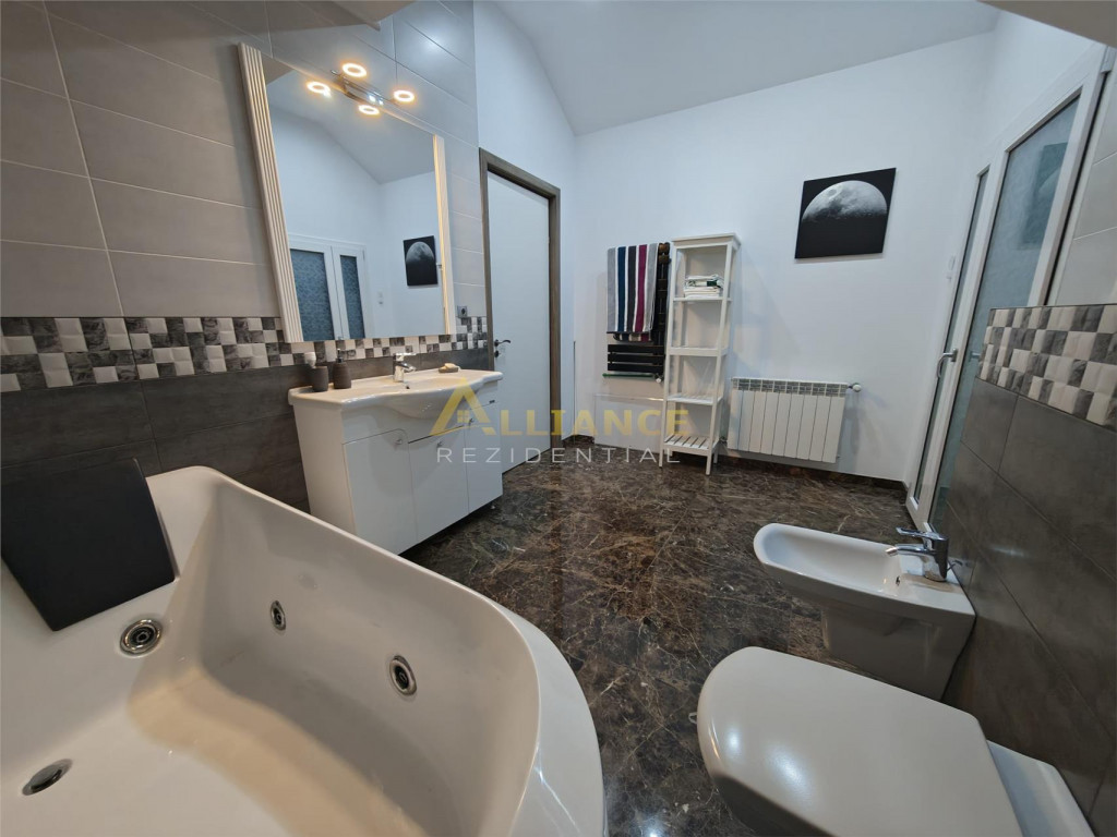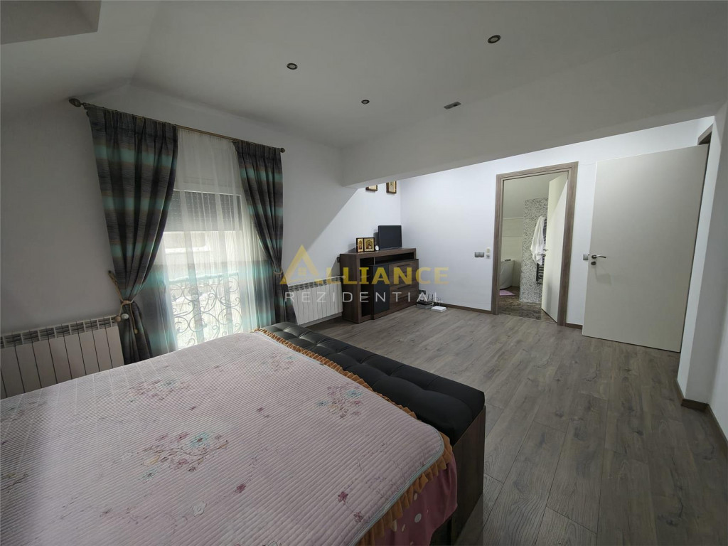 Se ofera spre inchiriere o casa spatioasa, ideala pentru familii numeroase sau activitati rezidentiale, cu o suprafata utila de 193 mp, amplasata pe un teren de 350 mp. Imobilul este excelent compartimentat si dispune de: 5 dormitoare 4 bai dormitor matrimonial cu baie proprie la parter al doilea dormitor matrimonial cu baie proprie la etaj Casa beneficiaza de incalzire in pardoseala, asigurand un confort termic optim. Proprietatea se inchiriaza exact asa cum este prezentata in poze, complet functionala si pregatita pentru mutare. Imobilul este conectat la toate utilitatile: gaz curent electric fosa ecologica put forat Un avantaj important il reprezinta localizarea excelenta, la doar 2 minute de mers pe jos de STV, cu acces rapid catre mijloacele de transport. Nu se accepta animale de companie. Pentru detalii si programarea unei vizionari: Gabi ndash; 0739 922 930