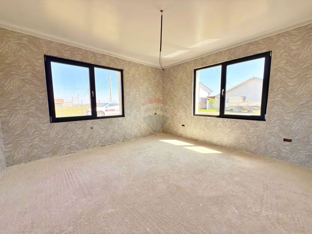 Vă propun spre vânzare, în exclusivitate, o casă situată în localitatea Frumușeni, județul Arad. Proprietatea are următoarele caracteristici: • Suprafață: 99 m² conform CF (88 m² utili conform certificatului energetic) + terasă de 71 m² • Teren: 300 m², cu două fronturi stradale (12 ml + 25 ml), proprietate amplasată pe colț • An construcție: 2021 • Utilități: curent electric și apă branșate; canalizarea este în curs de realizare (momentan se folosește fosă septică); gazul este disponibil peste drum de proprietate • Compartimentare: 3 camere (living și 2 dormitoare), bucătărie, baie, terasă și cameră tehnică Dotări și specificații: construcție din cărămidă Porotherm, tâmplărie antracit „4 anotimpuri” cu 3 straturi de sticlă, terasă și cameră tehnică închise în PVC și izolate cu cărămidă Porotherm, asemenea casei etc. Vă invit la vizionare!
