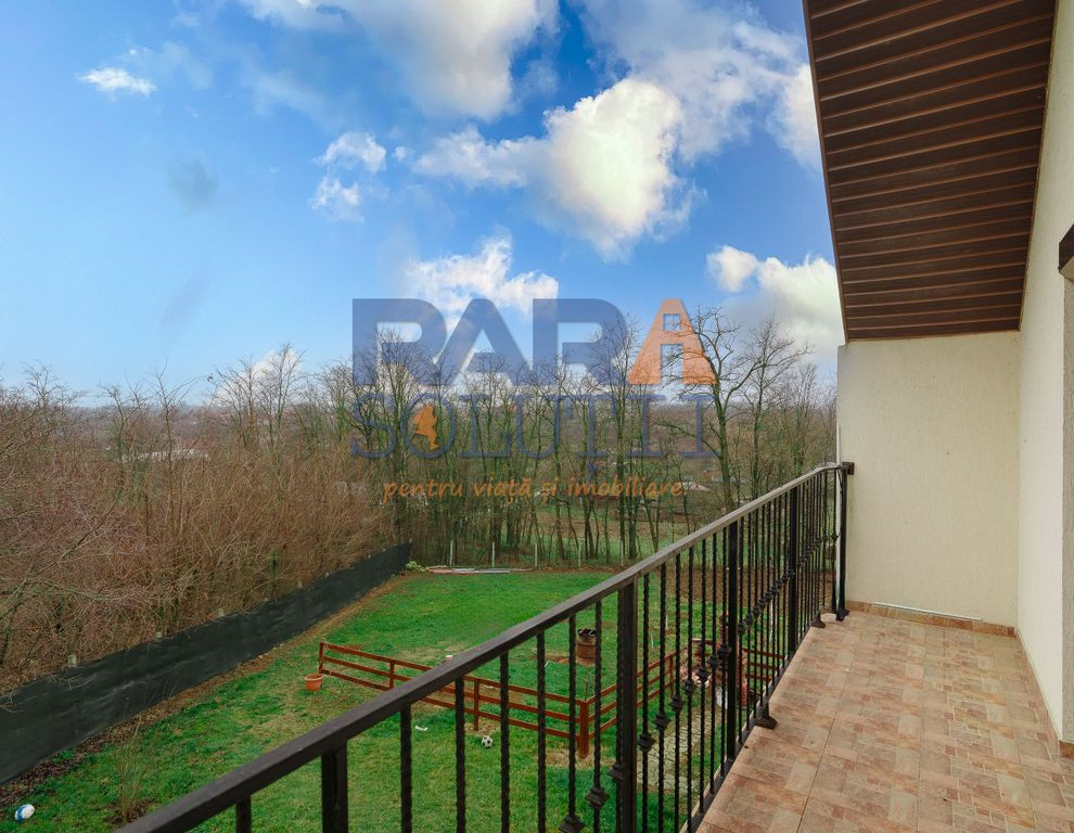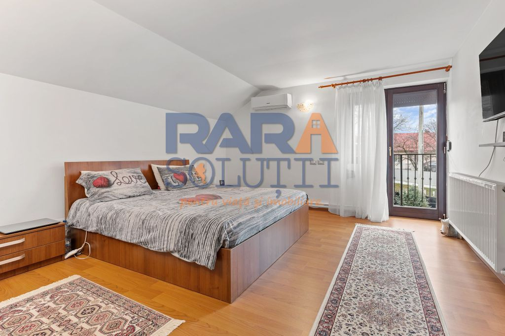 Etaj: 2 dormitoare mari cu balcon comun, 1 dormitor mic cu balcon propriu, baie, hol
