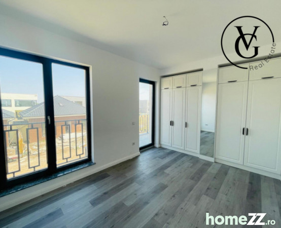 - Etaj: dormitor matrimonial cu dressing, baie proprie și balcon, două dormitoare secundare cu acces pe balcon, baie