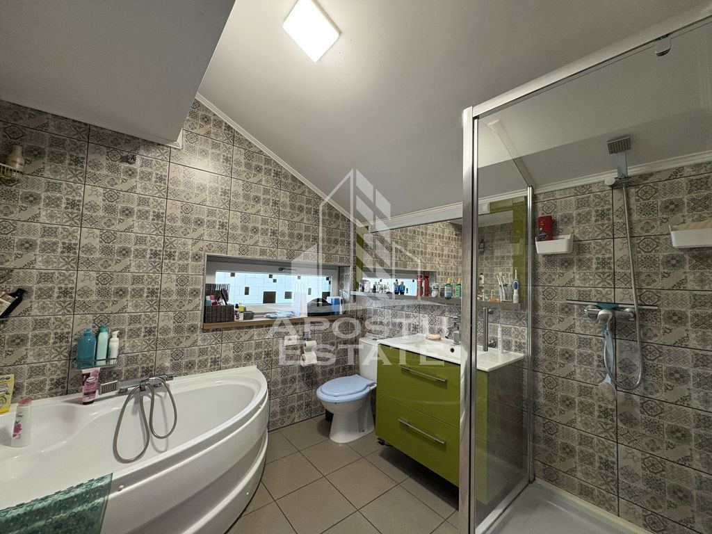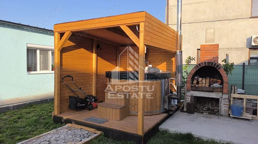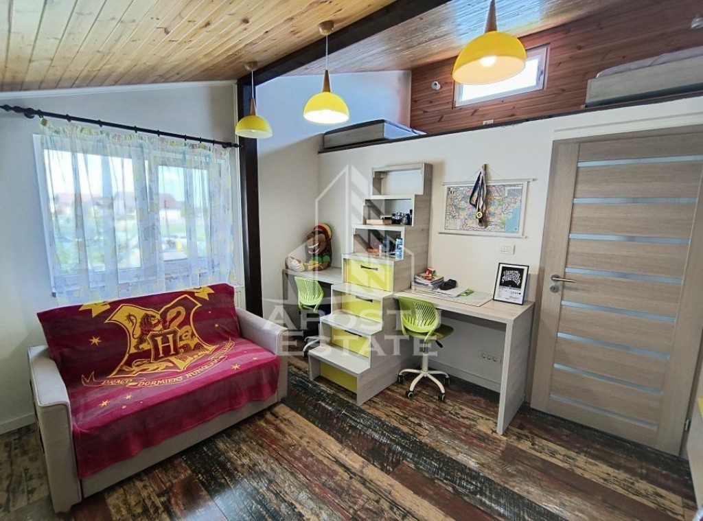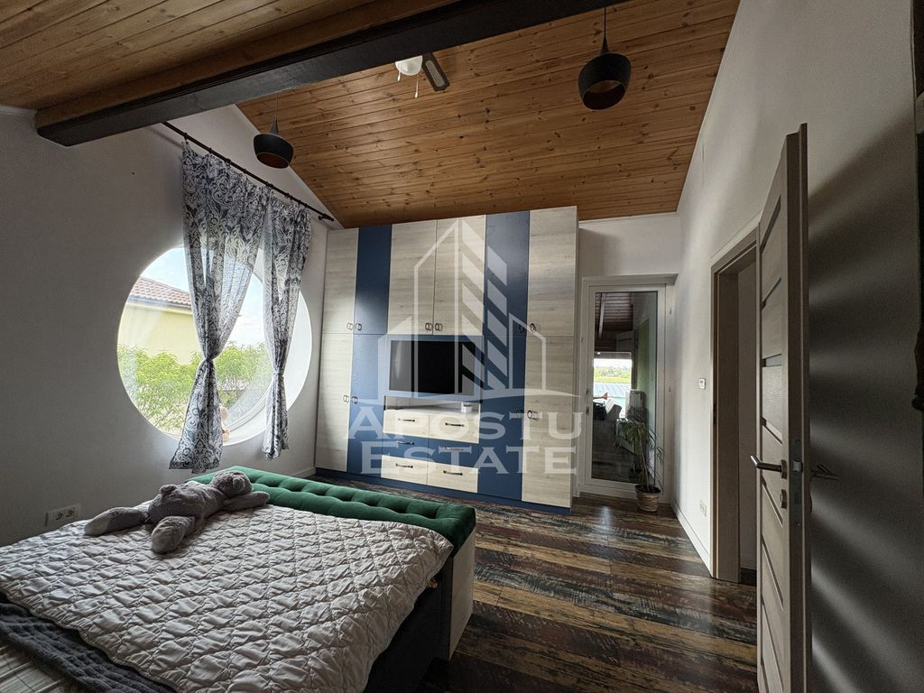 APOSTU ESTATE propune spre vanzare casa tip individuala, cu regim de inaltime Parter + Mansarda, situata in Mosnita Noua, zona Calea Medves. Proprietatea are 6 camere, suprafata utila de 150 mp si teren de 610 mp. An constructie: 2020, structura beton, zidarie BCA Ytong de 40 cm. Imobilul dispune de urmatoarele utilitati: curent electric, apa forata, gaz, curent trifazic, CATV, acces internet, fibra optica. Apa de la retea se afla la strada, dar nu este racordata. Casa este ideala pentru a dezvolta un business si pentru a locui. Compartimentarea este dispusa dupa cum urmeaza: Parter: hol, living, baie, bucatarie inchisa, un dormitor, o camera depozitare, terasa inchisa cu sauna, incalzire pardoseala Mansarda: hol, 2 dormitoare (unul cu balcon de 12 mp), baie, dormitor matrimonial cu terasa mare si loc de joaca tenis de masa, calorifere In spate este construit un garaj de 77 mp ce se poate folosi ca atelier, iar langa garaj regasim un apartament de 2 camere de aproximativ 40 mp. Finisajele interioare sunt moderne: Usa intrare: PVC Usi interioare: celulare Tamplarie ferestre: PVC Podele: parchet, gresie Casa se vinde mobilata si utilata cu: plita, cuptor, hota, masina de spalat rufe, uscator rufe, masina de spalat vase, frigider cu congelator. Imobilul dispune de centrala proprie pe gaz si pe lemne care functioneaza in tandem. Curtea este amenajata cu beton amprentat, ciubar, sauna, gazon si pomi fructiferi. Casa dispune de 5 locuri de parcare. Pentru mai multe detalii sau pentru a programa o vizionare, va stam la dispozitie.