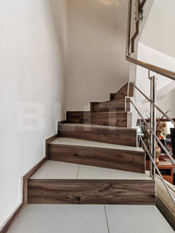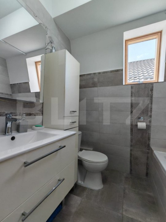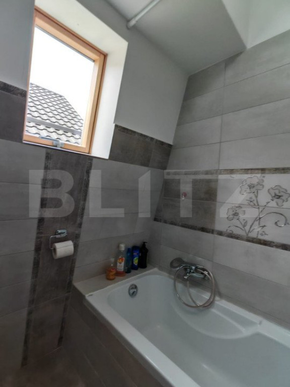 Blitz Imobiliare vă prezintă spre vânzare o casă cuplată într-o clădire cvadruplă, construită în urmă cu doar 5 ani, cu materiale de înaltă calitate și o izolație excelentă. Această casă se dezvoltă pe 3 niveluri, fiind perfectă pentru o familie ce caută confort și intimitate într-o zonă liniștită, dar aproape de Brașov. La parter: Intrăm direct din curtea interioară într-un living spațios de 27,76 mp, ce beneficiază de un design modern, cu bucătărie open-space. De asemenea, la acest nivel găsim o baie modernă dotată cu cabină de duș. La etajul 1: Mergând pe scări ajungem la două dormitoare de 11 mp și respectiv 12 mp, ambele cu acces la un balcon comun. De asemenea, aici se află o baie elegantă cu cadă, ideală pentru momente de relaxare. La mansardă: La ultimul nivel al casei se află un dormitor extrem de generos de 27,33 mp, cu dressing inclus. Acest spațiu poate fi personalizat după preferințele noilor proprietari, existând posibilitatea de a amenaja o chicinetă, o baie suplimentară sau chiar o cadă modernă în dormitor. Casa este foarte bine izolată și beneficiază de o expunere sud-estică, asigurându-i o temperatură plăcută pe tot parcursul zilei. Curte proprie: Veți avea parte de intimitate și relaxare, iar curtea proprie dispune și de un loc special amenajat pentru parcare, cu un panou de baschet. Locație excelentă: Casa oferă o vedere superbă către Poiana Brașov și este aproape de supermarketuri, centru SPA, piscină și aeroport, având totodată o distanță de doar 10 minute față de Brașov. Dacă doriți să locuiți într-o casă modernă, într-o zonă liniștită, nu ezitați să ne contactați pentru mai multe informații! Cod ofertă / ID BLITZ: P141883 Id intern: P141883